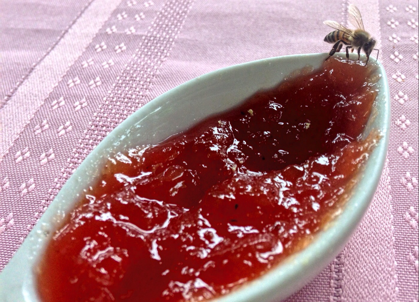 Yesterday’s bees told today’s bees we were easy marks at breakfast time, so we got to eat with at least twenty bees today! Yes!