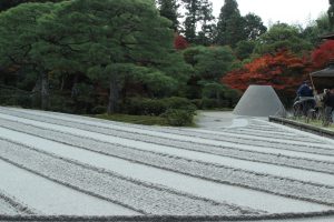 We went to Ginkaku-ji early to avoid the tourist hordes, which surely would be worse because it was becoming peak leaf time in Kyoto. Ginkaku-ji is at the top of a small incline and at the end of a row of shops, and this morning it was quite chilly. The locals were, of course, wearing winter outfits…we were not.
