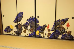 Our last stop on our weary legs was Shoren-in, which had both a beautiful garden and and an open interior. We could wander the grounds freely and explore most of the house in our socks. It was many open, empty tatami rooms with decorative screens and objects from the people who lived there. The ceilings were also really low. For anyone taller than 5’6″, they might have hit their heads consistently on the dividers between rooms!