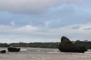 After the small town, we drove to Hoshizuna beach, or star sand beach, on the northwestern point of the island. It was windy. I had to lean into the wind to walk, and nearly fell over on the slippery tidal rocks a few times. The water was an unreal tropical blue despite the grey skies and stirring sands and nearby divers were exploring the coral reefs.