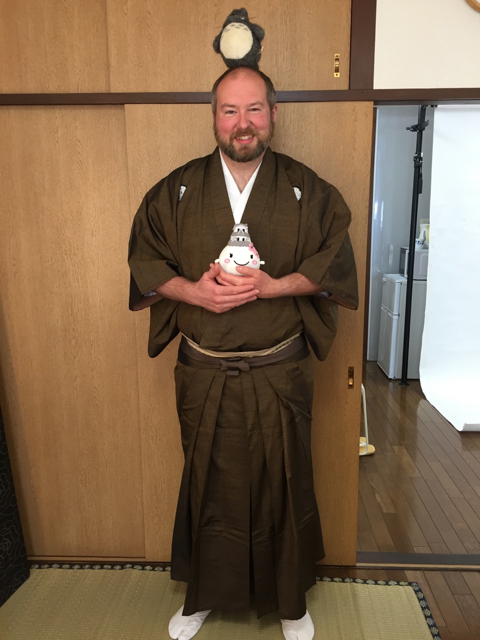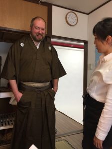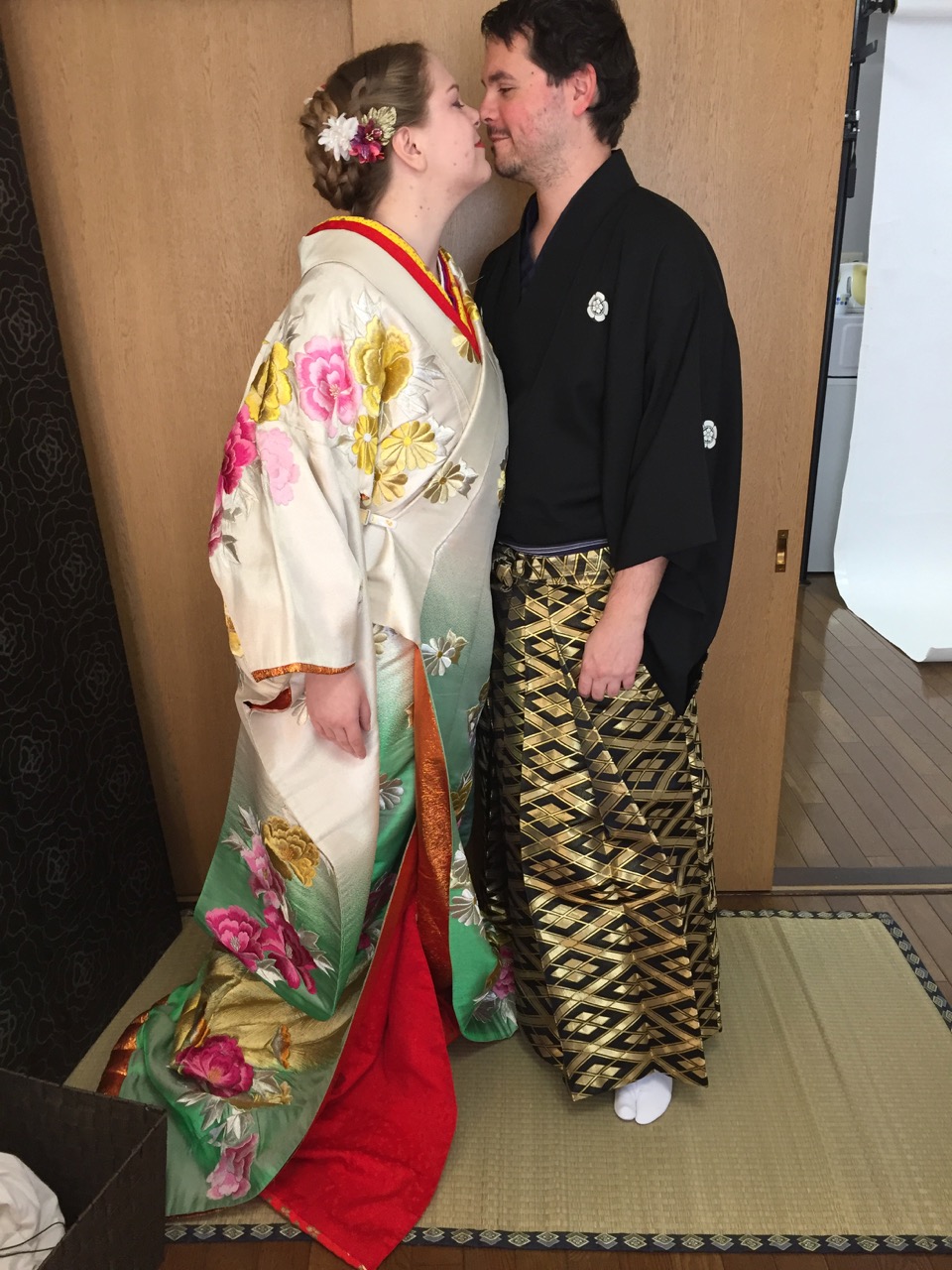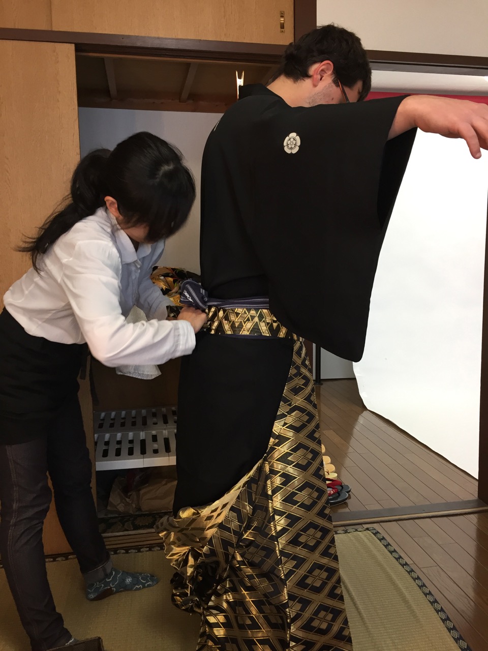 Hair and makeup done, they quickly dressed the men. They surprisingly had tabi socks that fit (!) their giant American feet. It took ten seconds of folding and wrapping and stepping for the guys to be ready in their outfits.