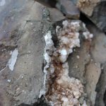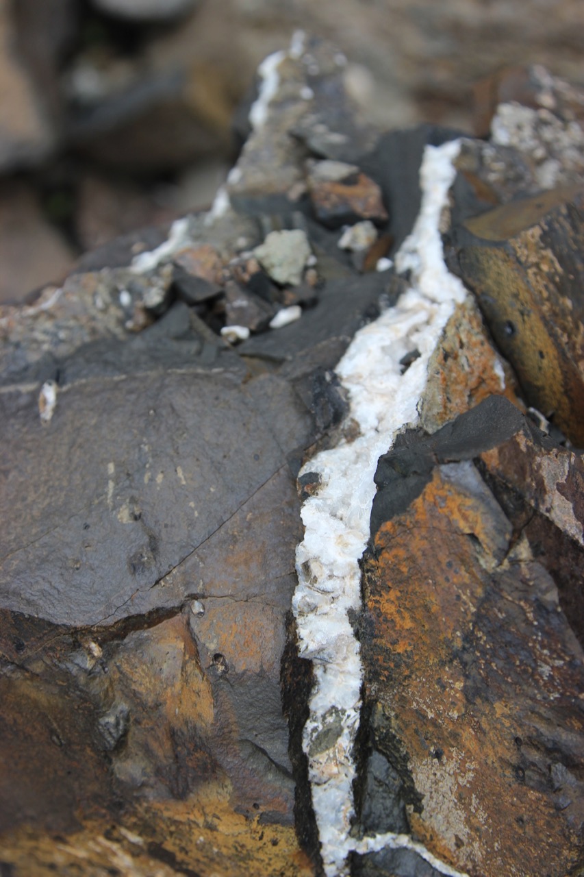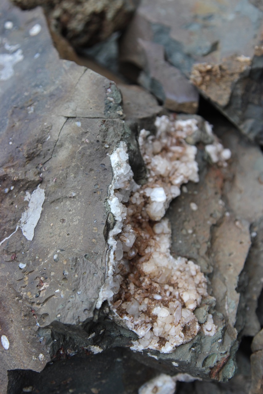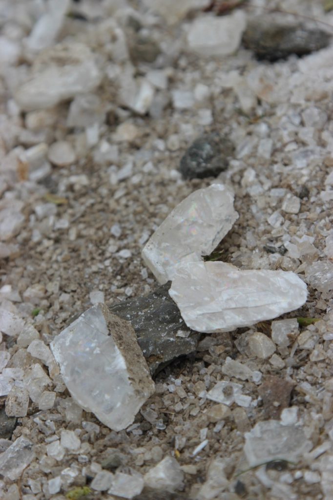 Up the hill further from the mine was a quarry. The rocks looked like they had bird poop on them, but they were actually deposits of spar crystals sprouting from the rocks. I climbed up to get a closer view of some of the veins and nearly ended up living up there as the descent was steep and tricky. If someone threw me trail mix and a blanket, I would probably have been fine.