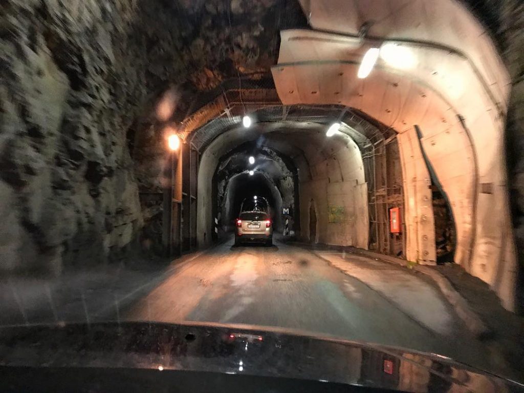 One lane blind tunnel with pull-off areas for passing – also check. Ahh!