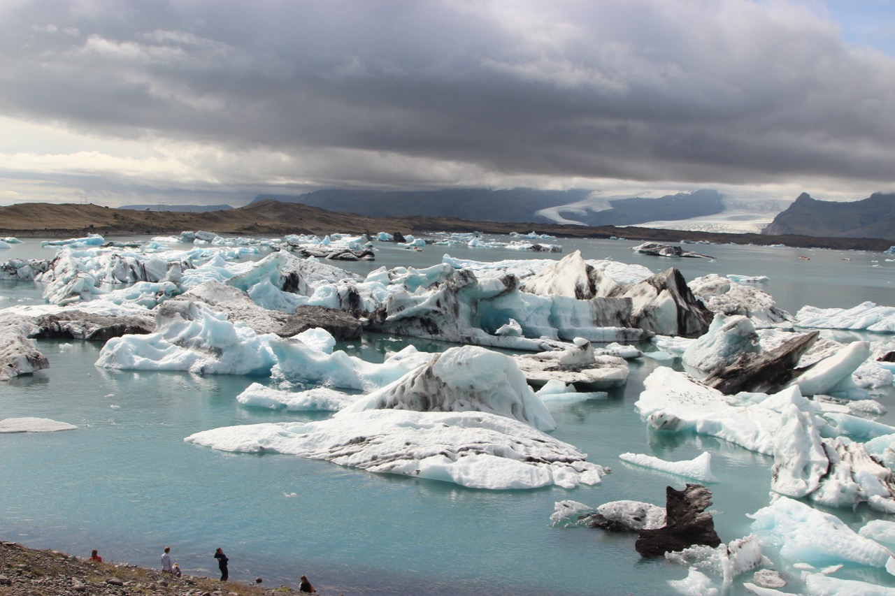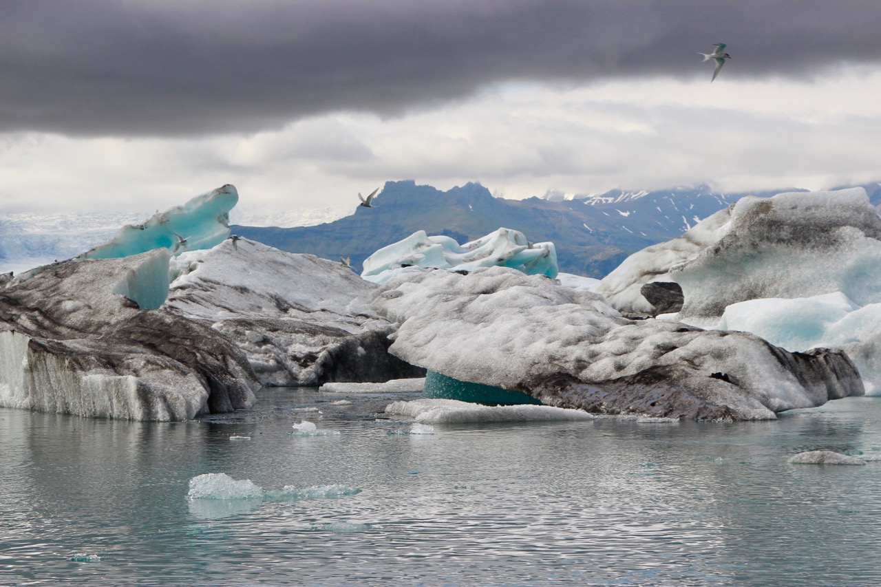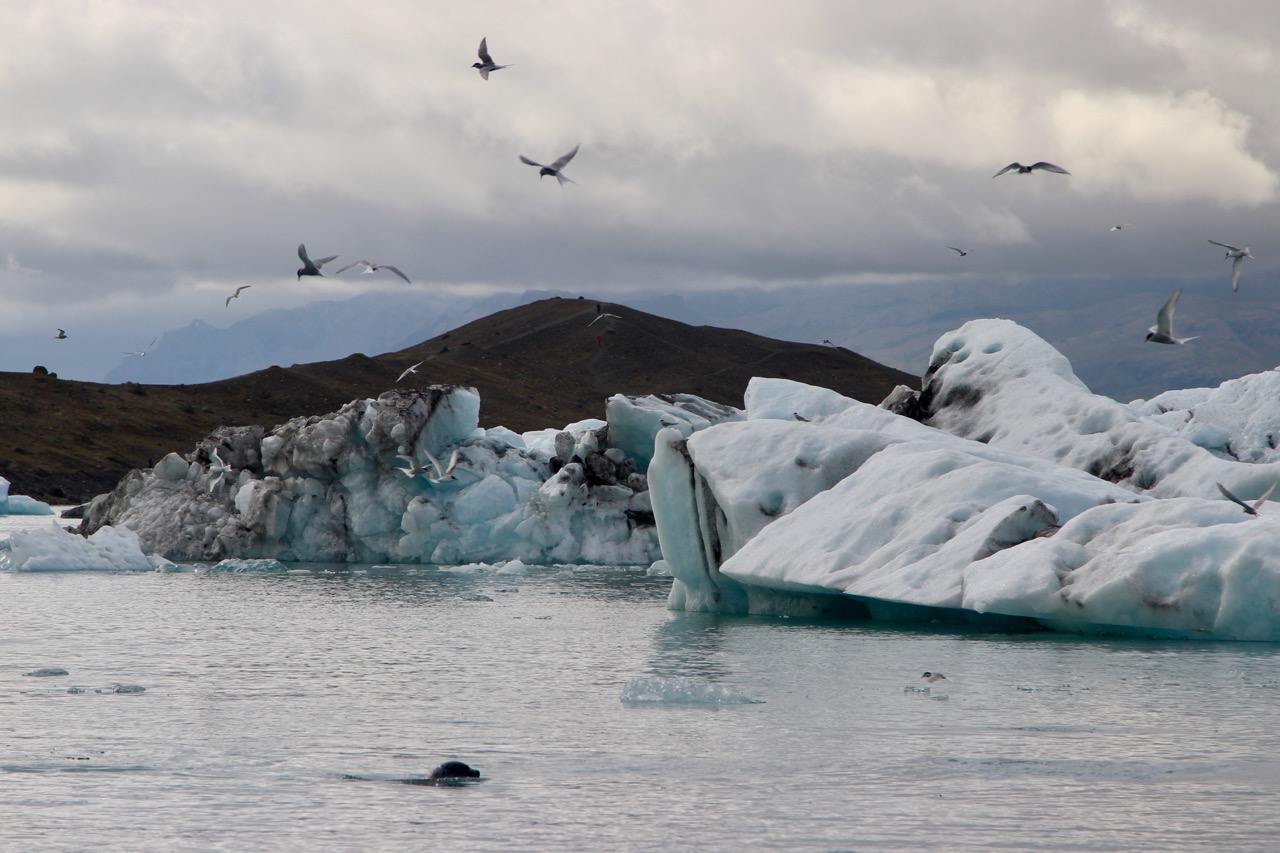 From Hofn, we went to Jökulsárlón, the iceberg lagoon just west of where we were staying. It is fair to say that Jökulsárlón was overrun with tourists – in buses, boats, vans. We gleefully joined them as we viewed the hordes viewing the blue, white, and black icebergs melting in the lagoon. We even saw seals!