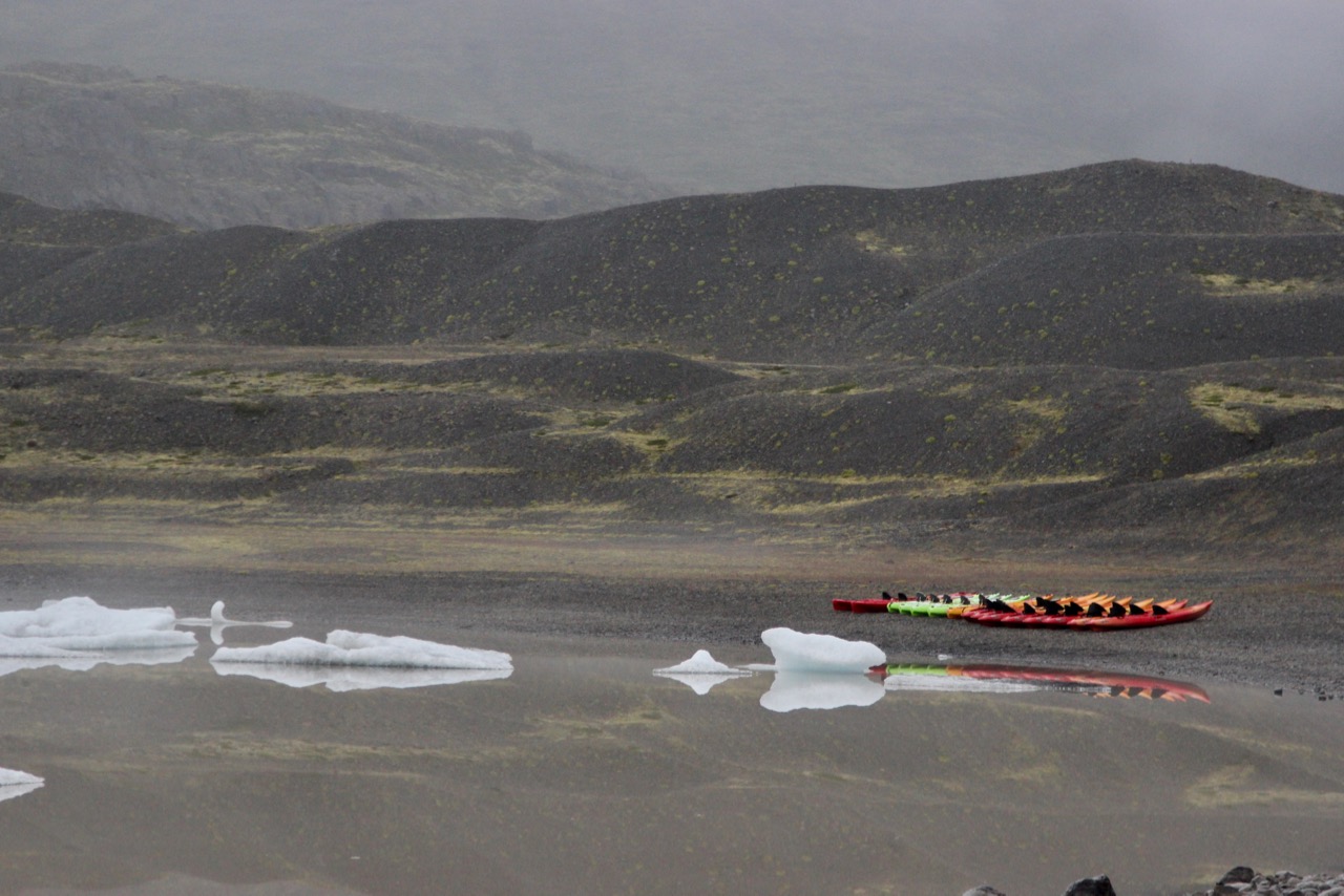 Definitely did not disappoint – it was like Jökulsárlón but less blue, and we were the only four humans there. We saw a gang of sheep in the parking lot and one other car heading somewhere mysterious, and there were about 15 colorful kayaks lashed together on the lakeshore. We were alone with the sound of rushing water to keep us company.