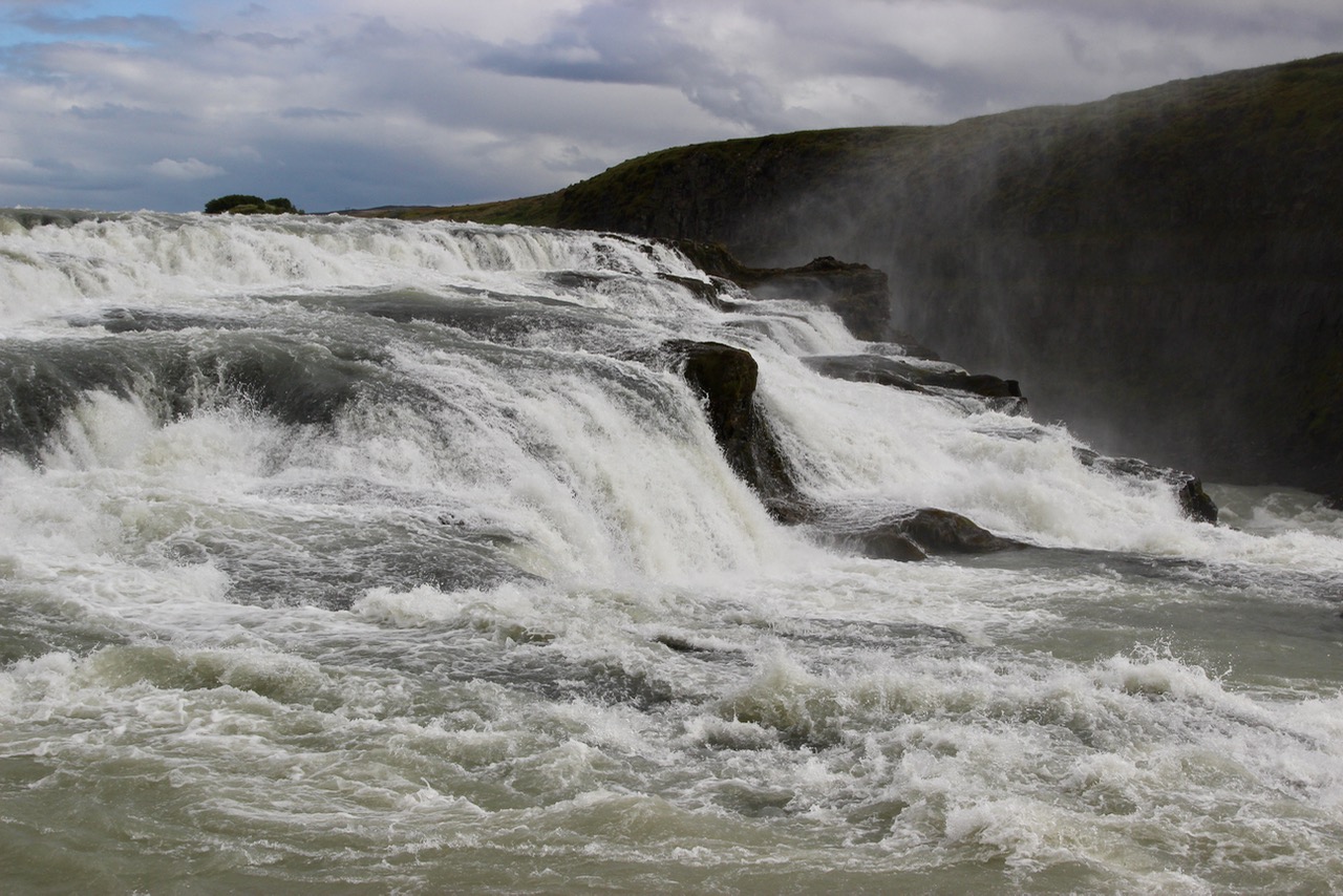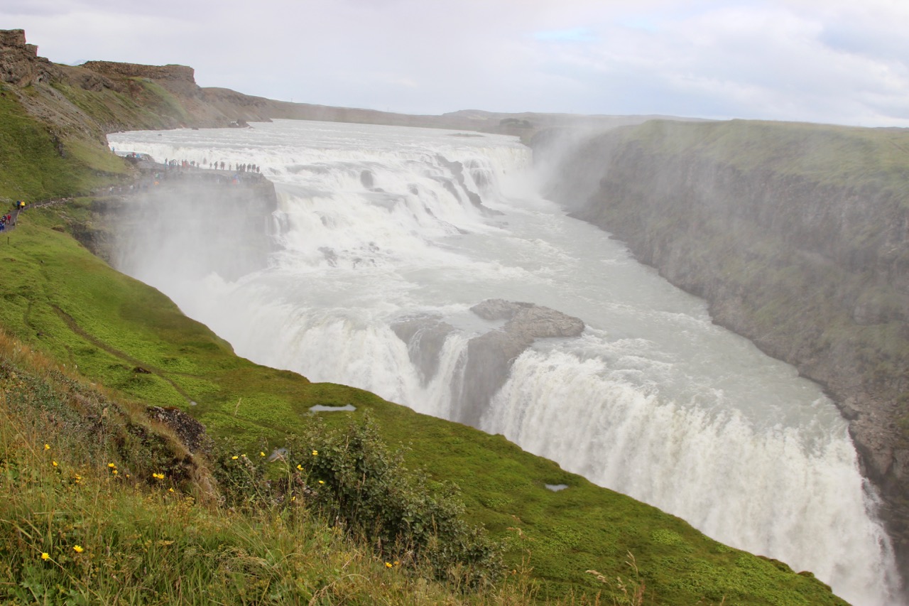 After Geysir, we visited Gullfoss, a large, two-tiered waterfall that was also tourist-laden as it is part of the golden circle. It was cascading down a wide river and thundered loudly. It reminded us a bit of the raw power of Dettifoss, but we stayed much dryer.
