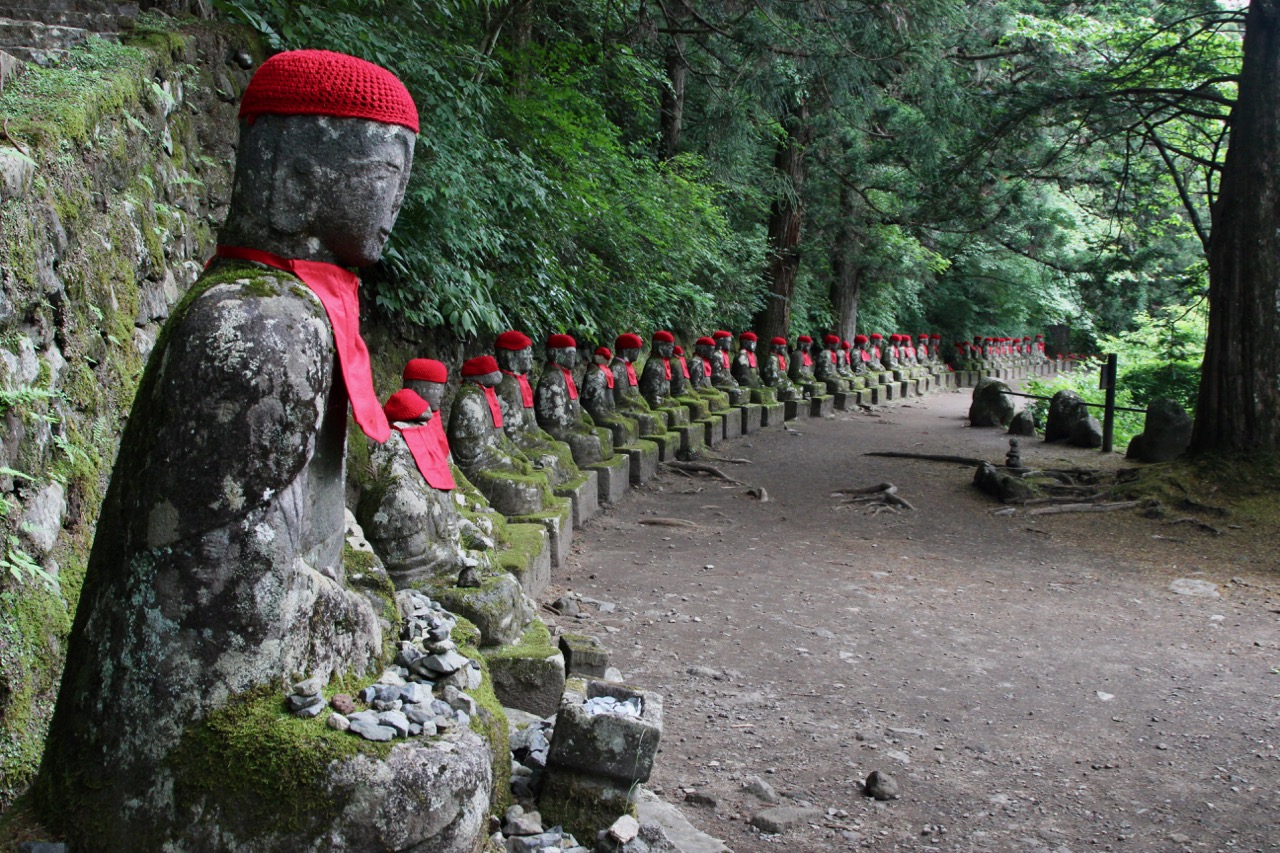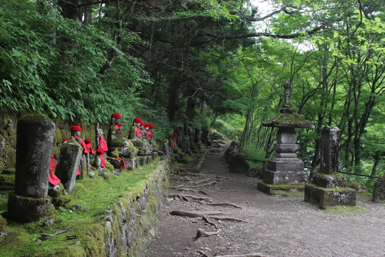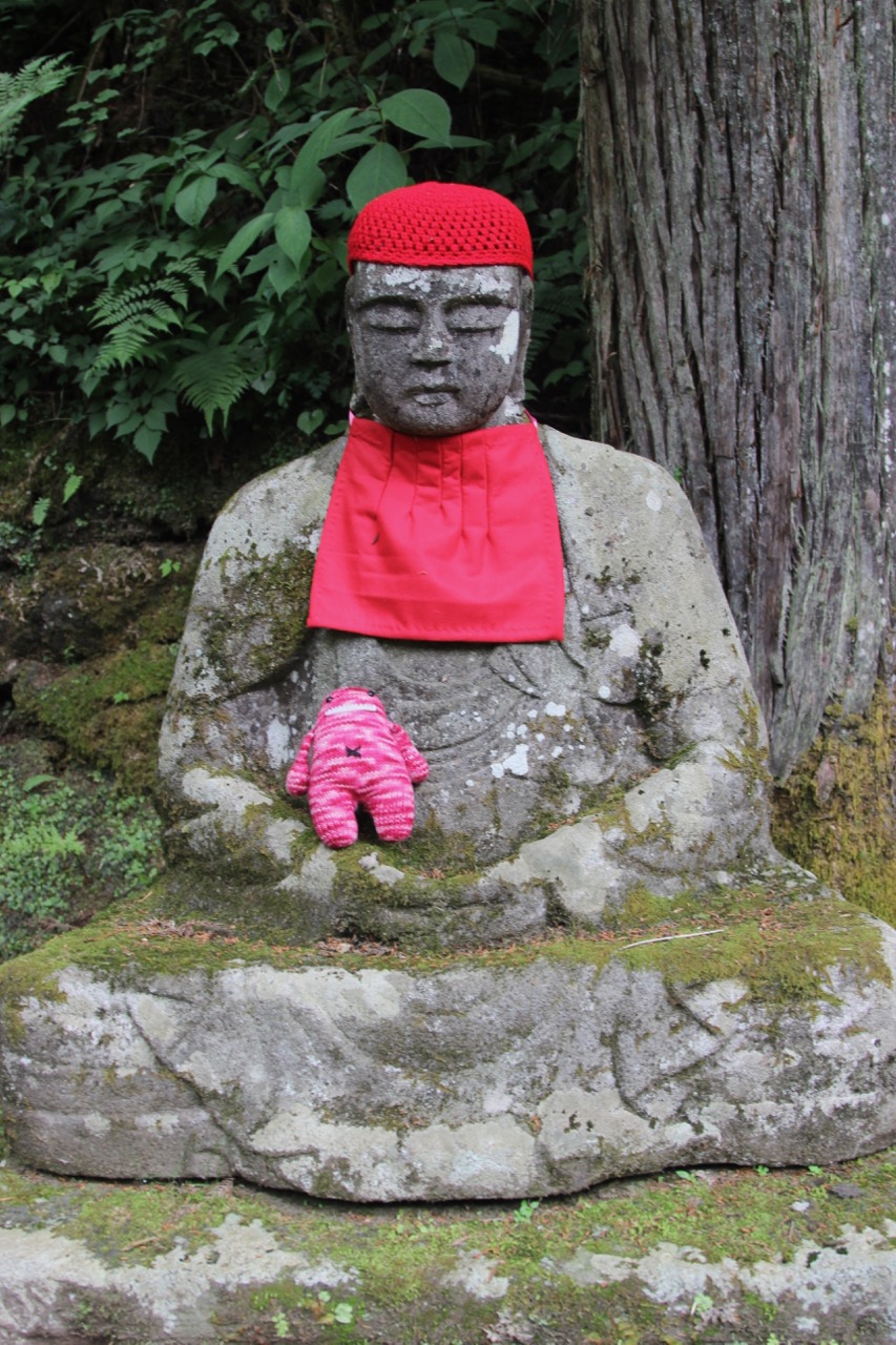 Despite the bear danger, I pressed onwards. The birds were singing cheerily and the river rushed closer. After a bit, I found theKanmagafuchi abyss, lined with Jizo, who watch over the deceased (EATEN BY BEARS???). The river was the same beautiful, clear blue as under the bridge, and it was really wonderful to have the place all to myself for most of the duration I was there. This area was less well-manicured than shrine grounds generally are, and all the stones were ancient and covered in moss.