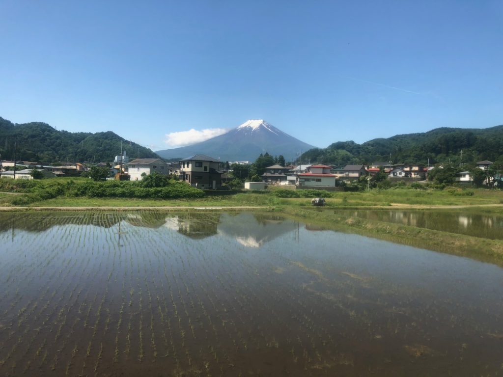 The train passed over rice fields and through mountain tunnels for the last hour of the ride, Mt Fuji peeping out from behind other mountain peaks as we drew ever closer. So far, it was visible and very sunny. Yeah!