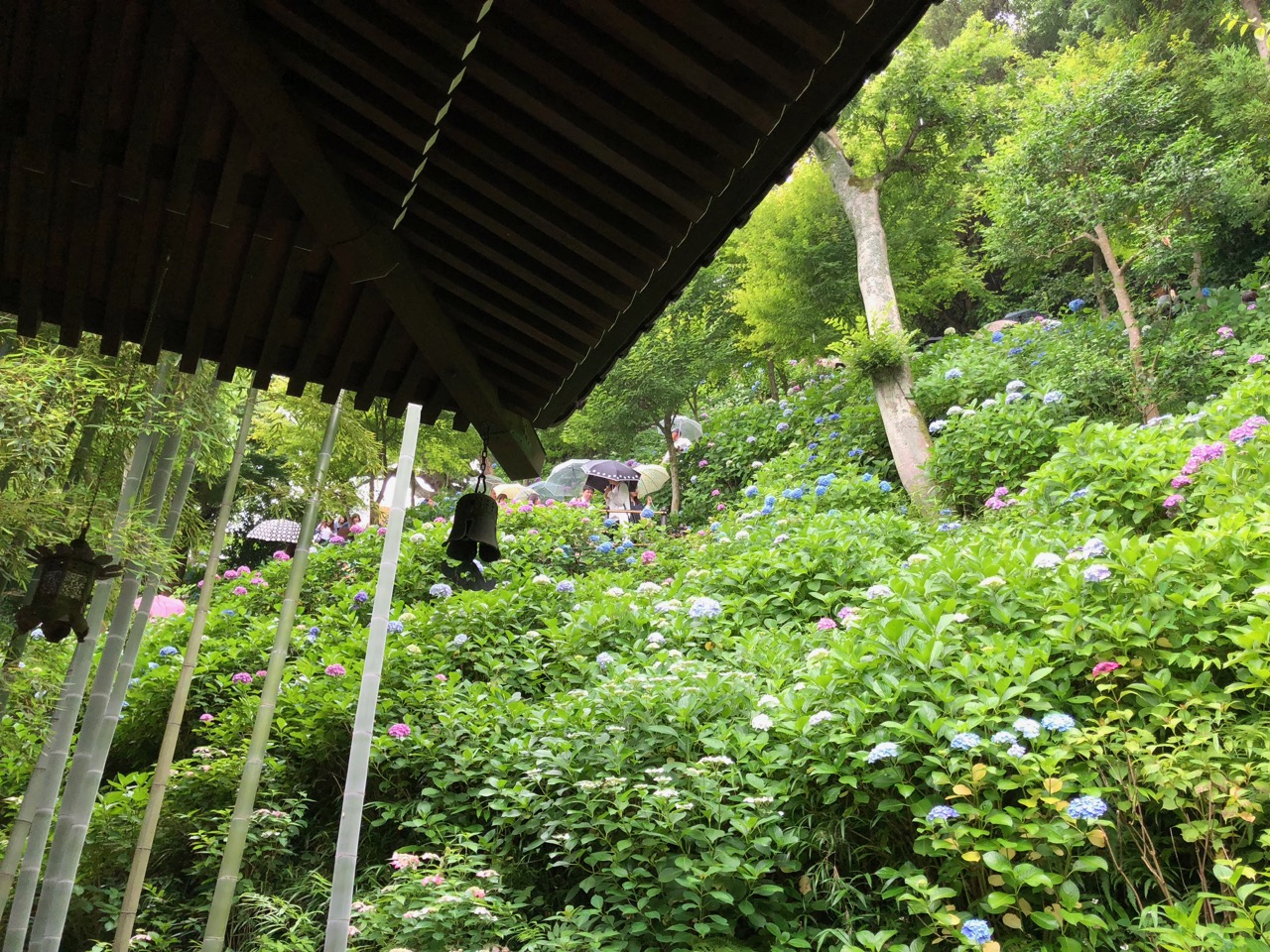 Little did I know, Hasedera too was stricken with Hydrangea Mania. The usual route up the hillside was gated and covered in hydrangea. According to math, I would have had to wait 60 minutes to go up the hill. Uhh…pass. It’s too cloudy for a good view across the bay today anyway. There were still a lot of nice views of the hydrangea against the bamboo below, and to its credit, Hasedera did have a pretty fantastic hydrangea collection.