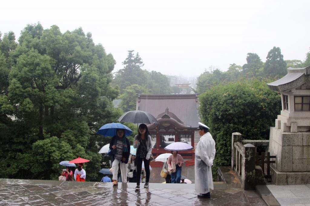 I took the tiny train back to the main station and slowly wound my way around other umbrellas, tourists, and hydrangea pots to Hachiman-gu, the largest Shinto shrine nearest the station. It’s dedicated to Hachiman, the god of war. This one is free (yay!) and as the rain intensifies, the crows kind of thin. It becomes slightly more obnoxious to take pictures and enjoy my time as it’s so wet. And…my camera lens is beginning to fog up uncontrollably, so that’s neat.