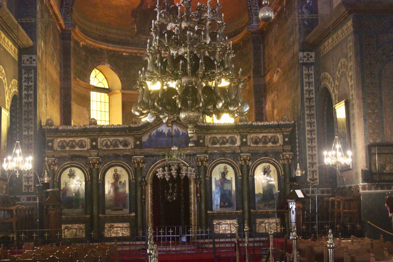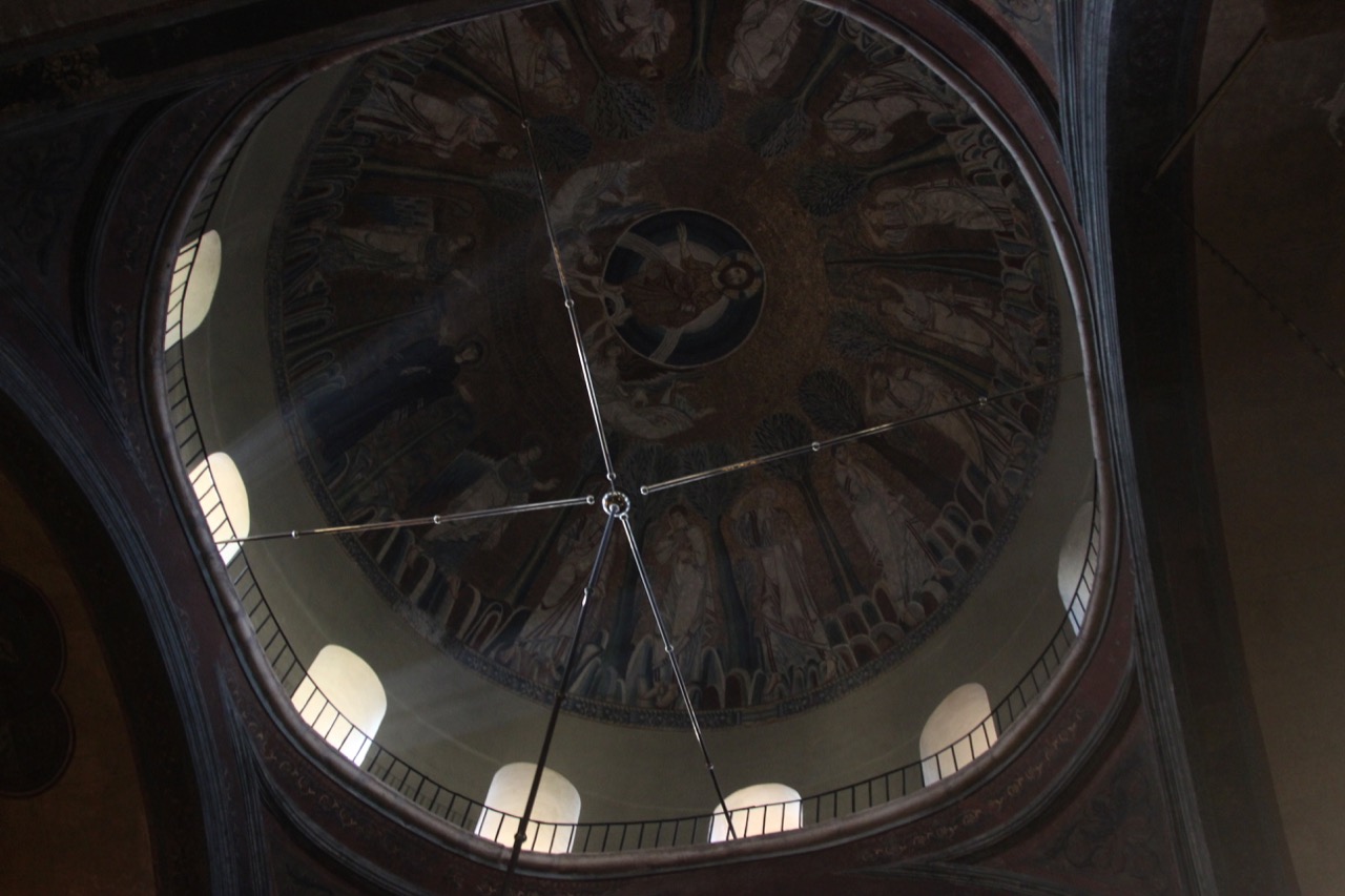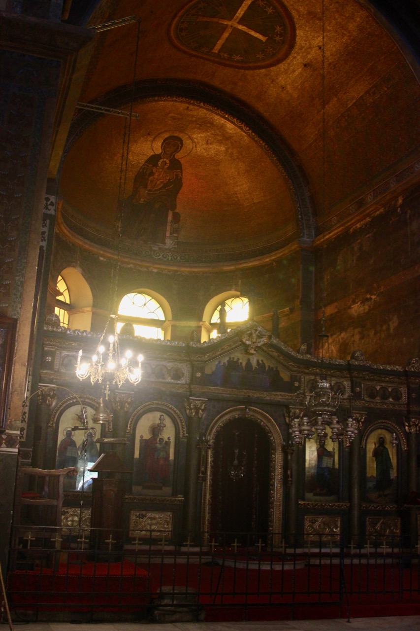 Our first stop after a slow morning was the Agia Sofia, an old orthodox church which has lots of art on display. It’s Byzantine so it’s down a few feet from the city proper. All of these old churches are dark, punctuated by dusty beams of light from stained glass windows, and have lots of frescoes, icons, and gold on most available surfaces. They look fairly utilitarian on the outside, which is an interesting contrast with the elaborate interiors.