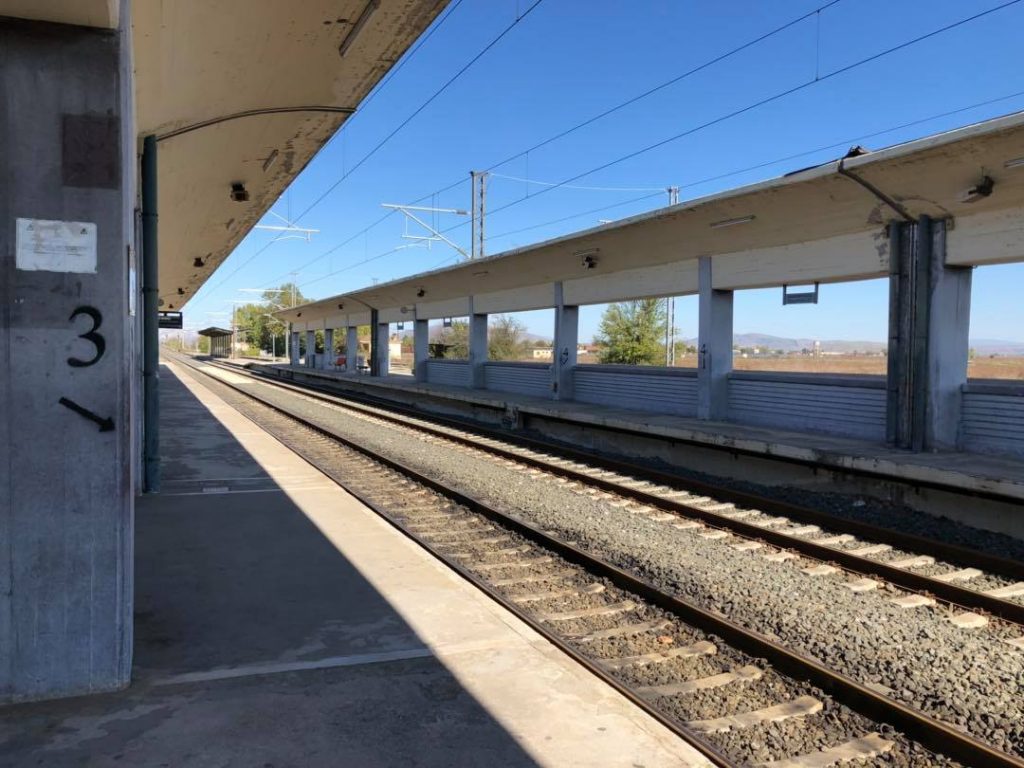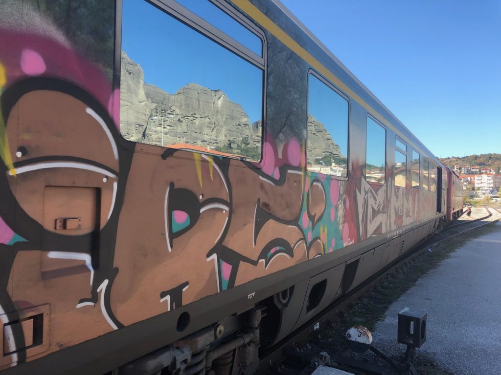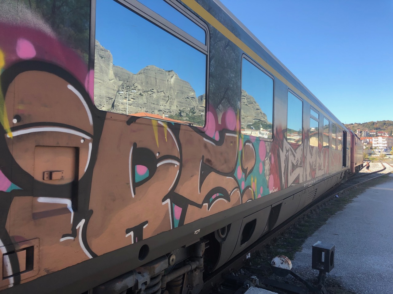 Our change in Palaeo-place (home of the dinosaurs, one Poke stop, and literally nothing else that we can see) is a small, dinky station with a few tracks. Oh, and no signs, because why would we have any signs anywhere. I don’t think that Ace of Base song made it here in the early 90s. At least this station’s platforms are labeled with general directions if you can slowly sound out Greek (yay) and I found one outdated and not helpful manual arrivals board in a corner. Someone tells us which train track it is thankfully and are able to successfully catch our train the rest of the way to Kalambaka.