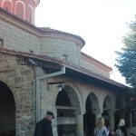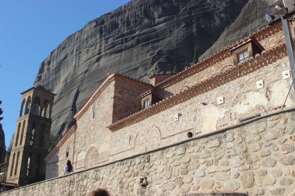 We only go inside one monastery tonight, St Stephen’s monastery, which is home to nuns who sell religious souvenirs and who do other nun things. If you are a lady who is entering, you must don a long skirt, as this is the way of the monasteries. We wore our beautiful skirts and wandered the grounds. This monastery offered an impressive view over the sprawling town of Kalambaka and the other monasteries. It had some pleasant and manicured rose gardens, complete with kitties. It also had a number of updated paintings and old paintings alike. In one, which was depicting the plague, a dude was being eaten by a medieval dragon. Sweet. The monastery also showcased old needlework and artifacts from people who have served the monasteries long past. All of the items were extremely elaborate and at least 500 years old.