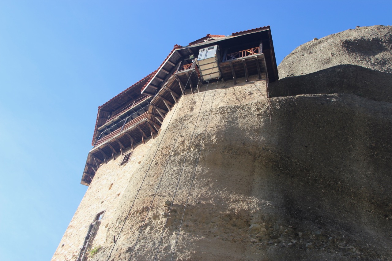 Our last monastery before lunch was Varlaam, the second biggest and second highest (and it had half the number of stairs – yeah!). It was a hike to get to, down the side of a mountain, across a gorge on a bridge, and then up eternally. This one had an old preserved net meant for hauling monks up and down the sides of the monastery back in the day. Hard pass, I will take the stairs. Now, they have a little gondola thing they ride across. I feel like monks long ago would frown on this. The tourist crowds were picking up and we left this one for lunch!