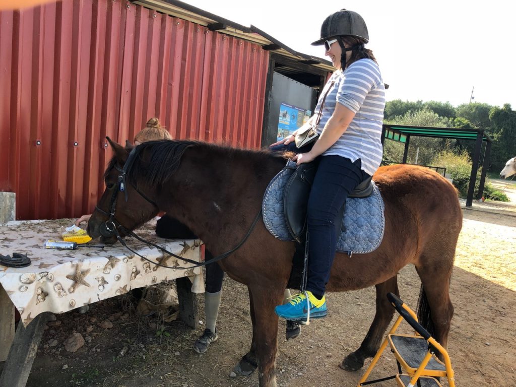 She saddled us up on three horses: One horse which I will just call “faroura” for lack of better understand of what the heck its Greek name was, Hoofy (spelling also a mystery), and Rocky (he was mine, and we did not listen to eye of the tiger).