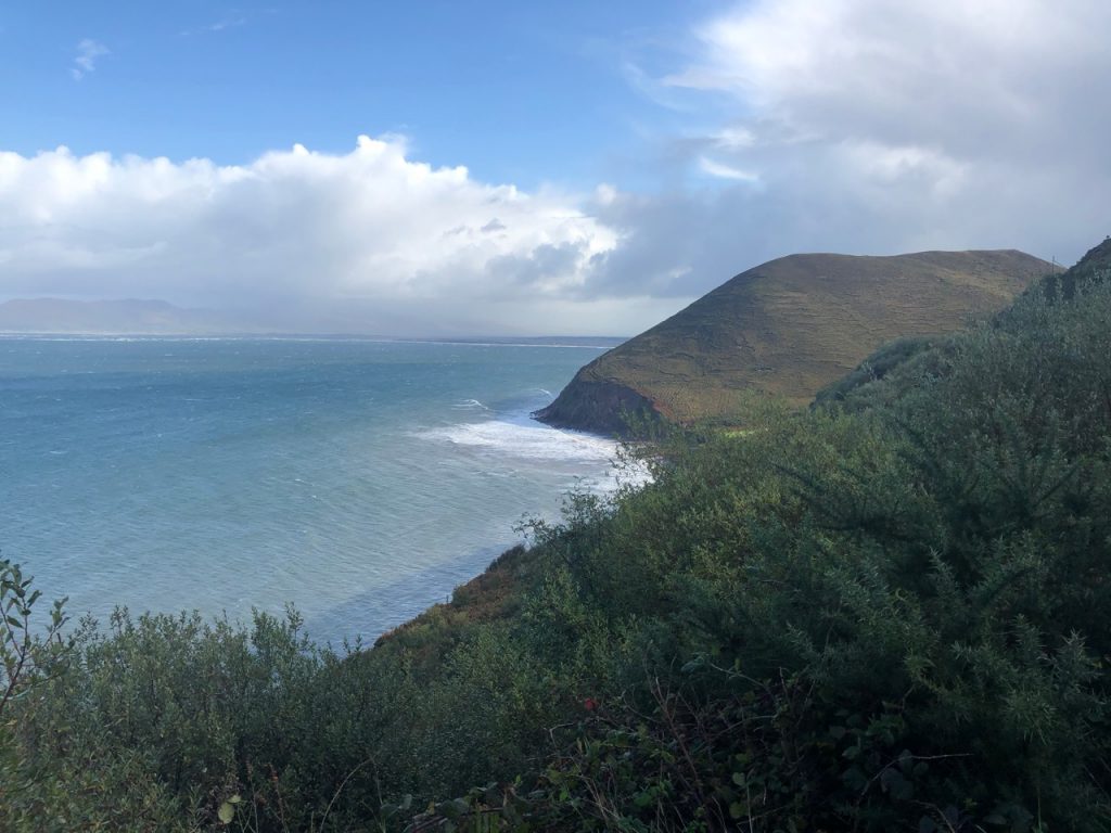 The road to Portmagee took us on a segment of the Ring of Kerry, famous for exquisite beauty and therefore tourist bus hordes. Fortunately, we were going the opposite direction of the buses, so we didn’t get stuck behind one. We zigzagged above bays and between hills. It looked a bit like Iceland but with trees.