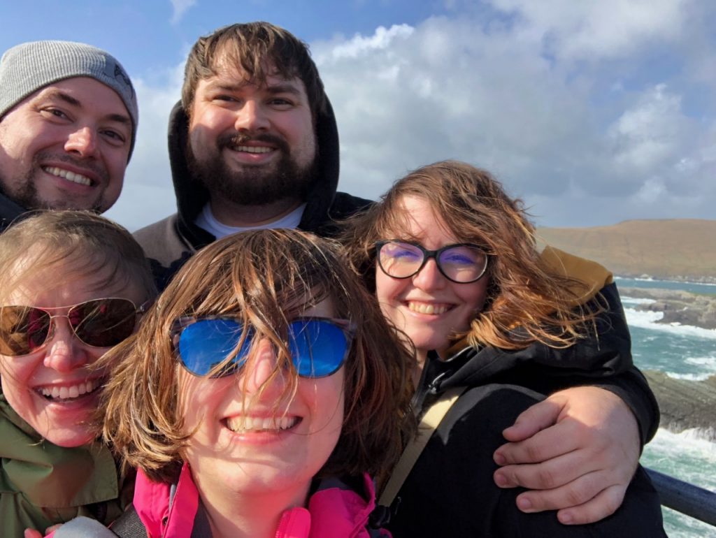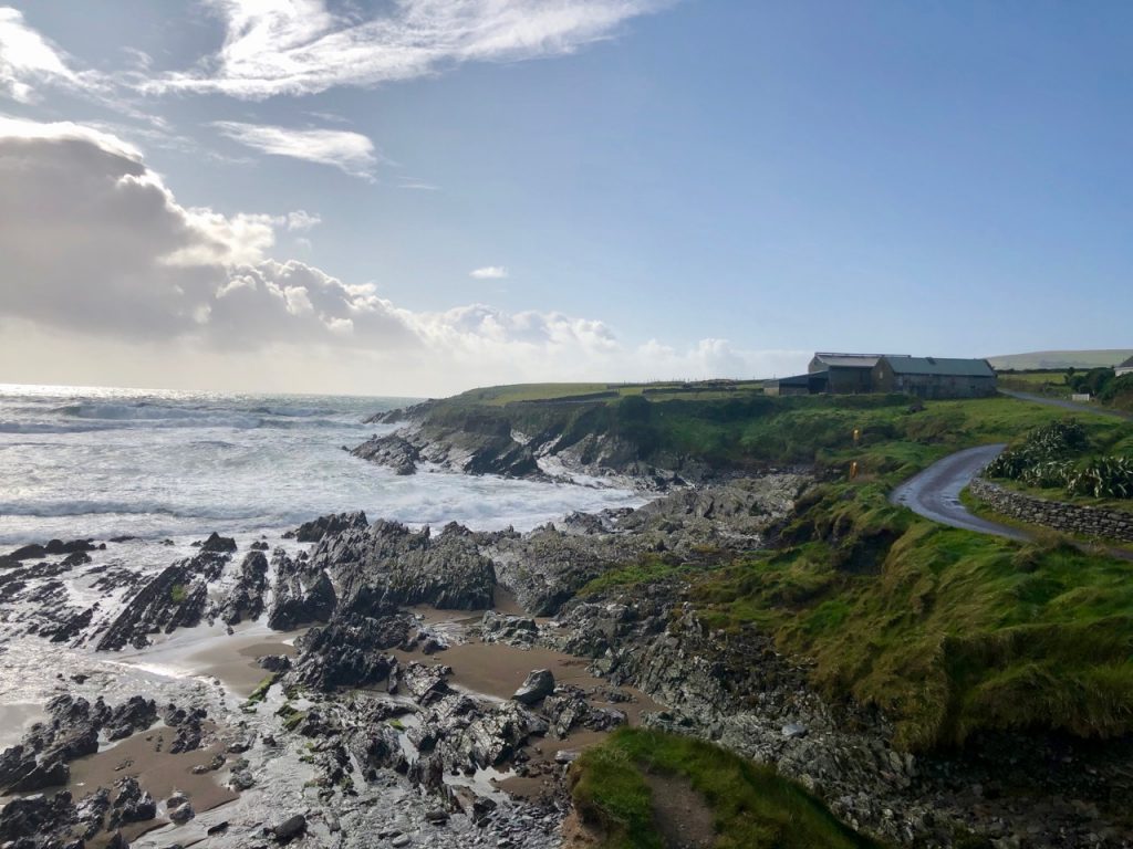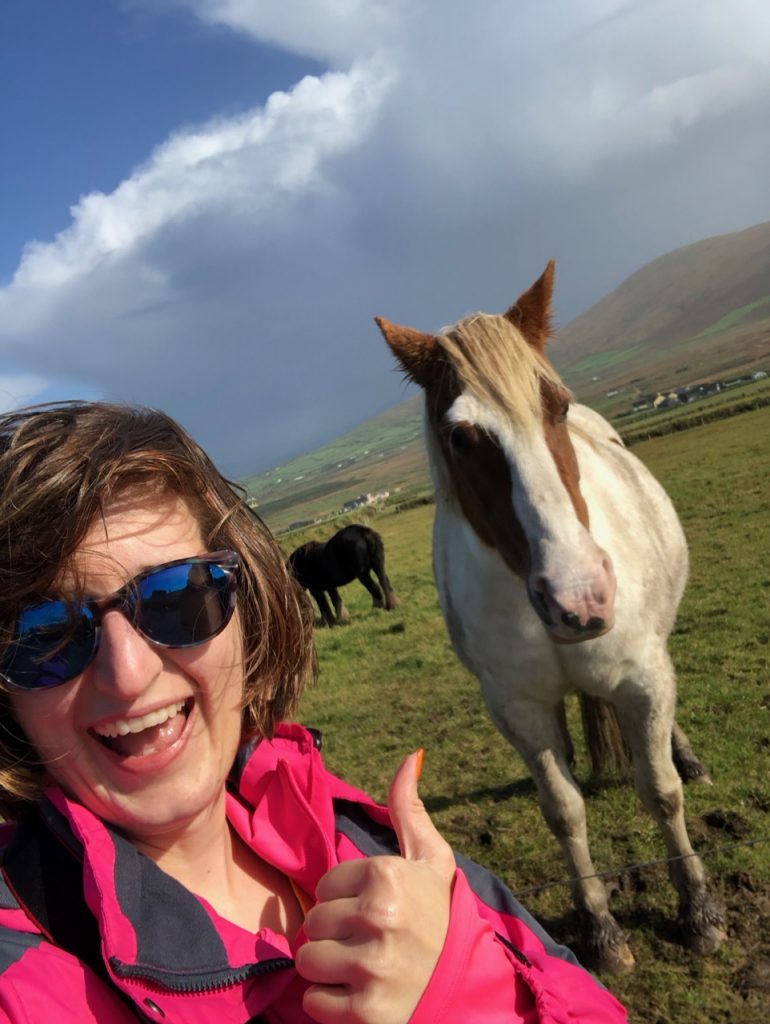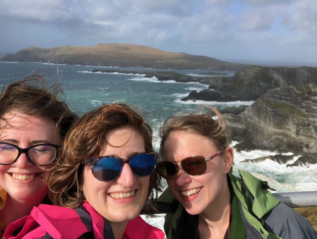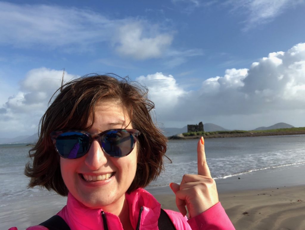 It’s got a small castle (Ballinskellig castle) just across the way from a small beach, which presumably gets warm enough to swim at in the summer. Walking to the castle was quite the long hike, and it was windy and cold, so I settled for taking a selfie with it. The braver (or foolish?) members of our party put their toes in the Atlantic. I did not wish for sand regrets. Pass.
