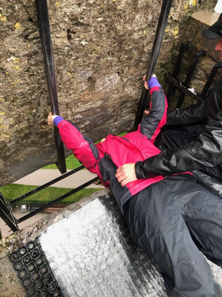 Once you survive the 1500 narrow steps and peek at the toilets and other rooms, you arrive at the Blarney Stone. To kiss it, you have to hang over a hole upside-down like spider man (albeit with guard rails and a hand-hold, unlike spider man). This is probably not my brightest moment but at least my butt ain’t gettin’ wet cause I have my rain pants.