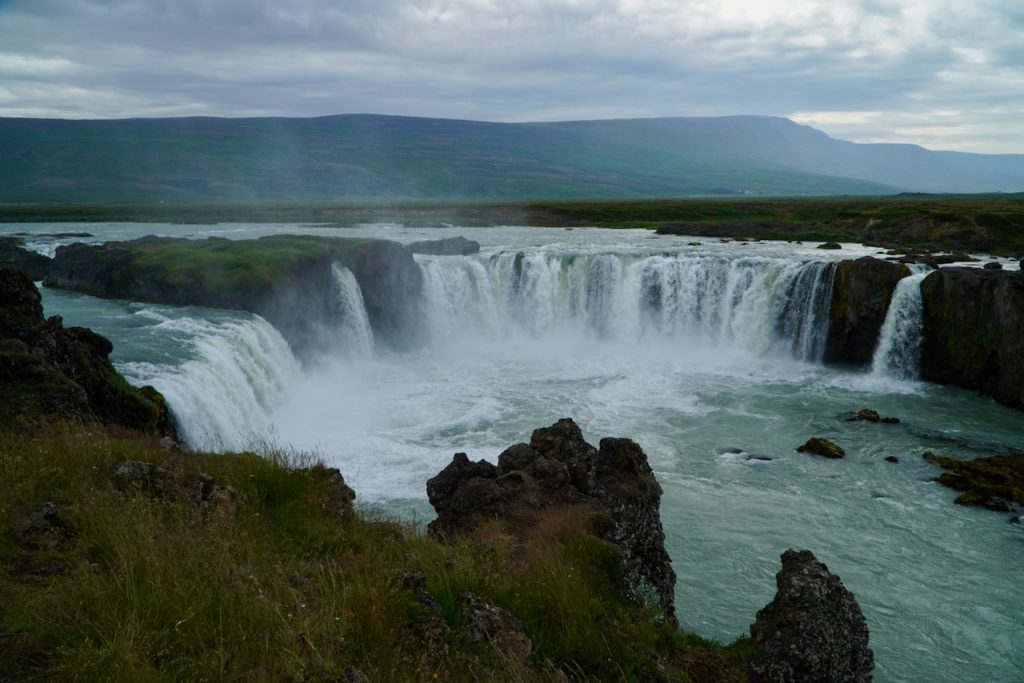 Ending our day, we made a quick visit to Godafoss, a lovely waterfall just west of the lake. Last time we got here, it was golden hour, so I have a stunning sunset photo of it. No sunset today – but it was still beautiful.
