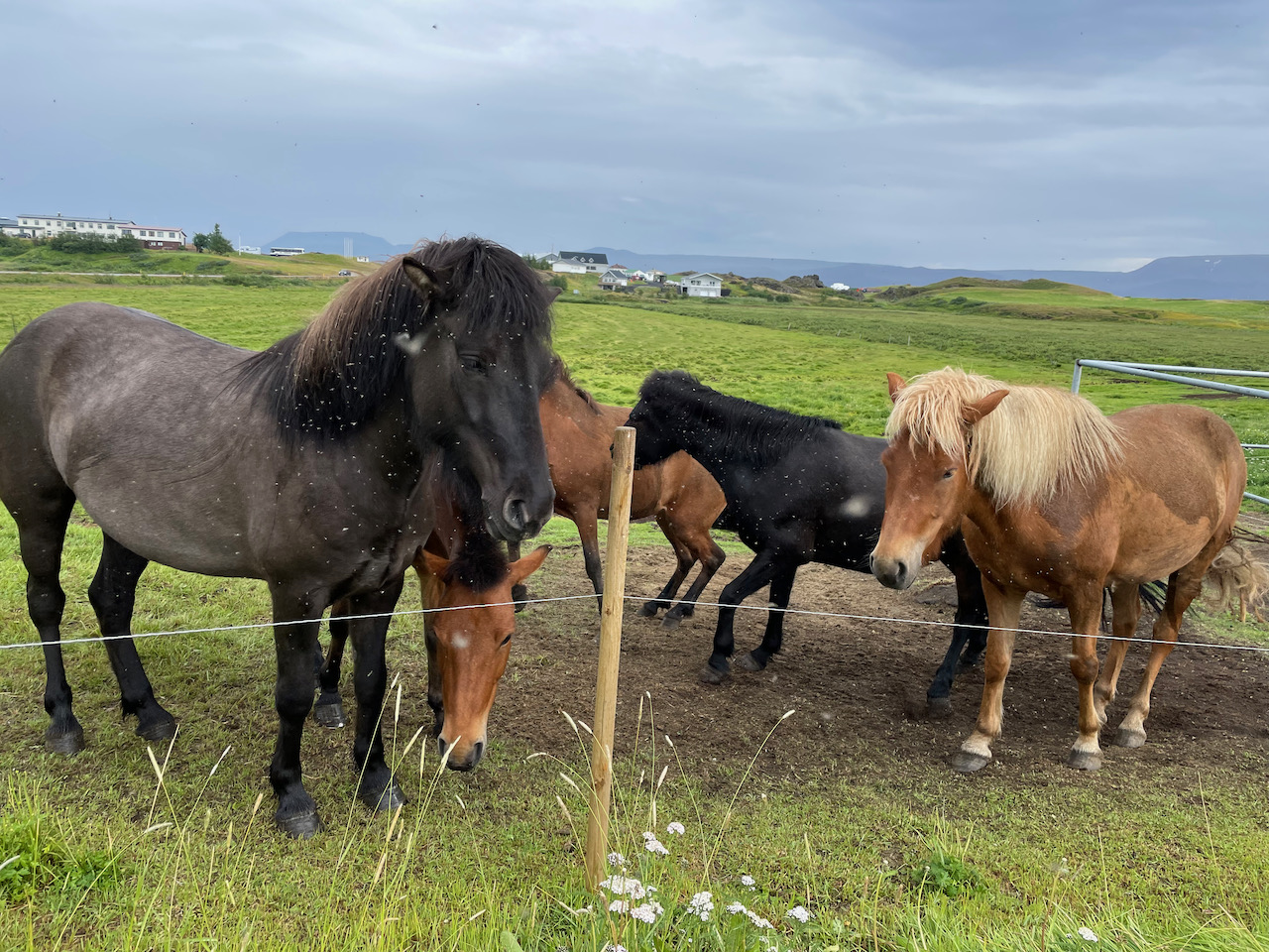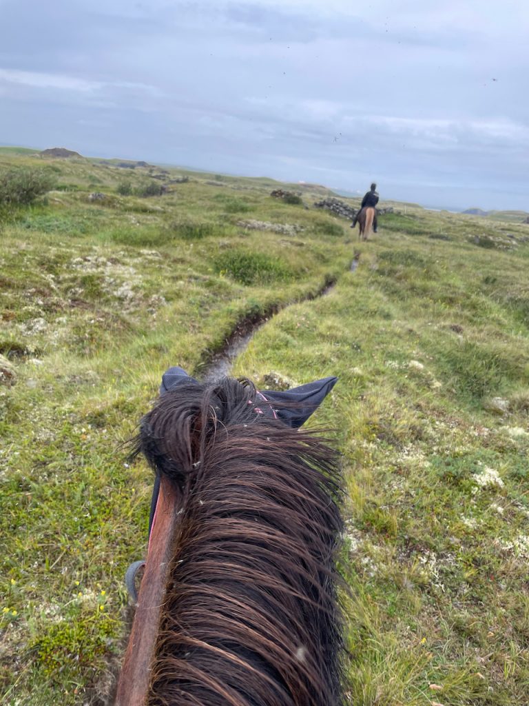 Our ride started out quite rainy, but the weather cleared up as we moved along. The flies were absolutely bonkers and I was very grateful for the netting. We proceeded through rolling volcanic fields and out between the lake and river, across narrow ridges just wide enough for the horses. Our guide taught us the difference between the tolt and the trot – and I actually figured out how to get my horse to tolt instead of trot!