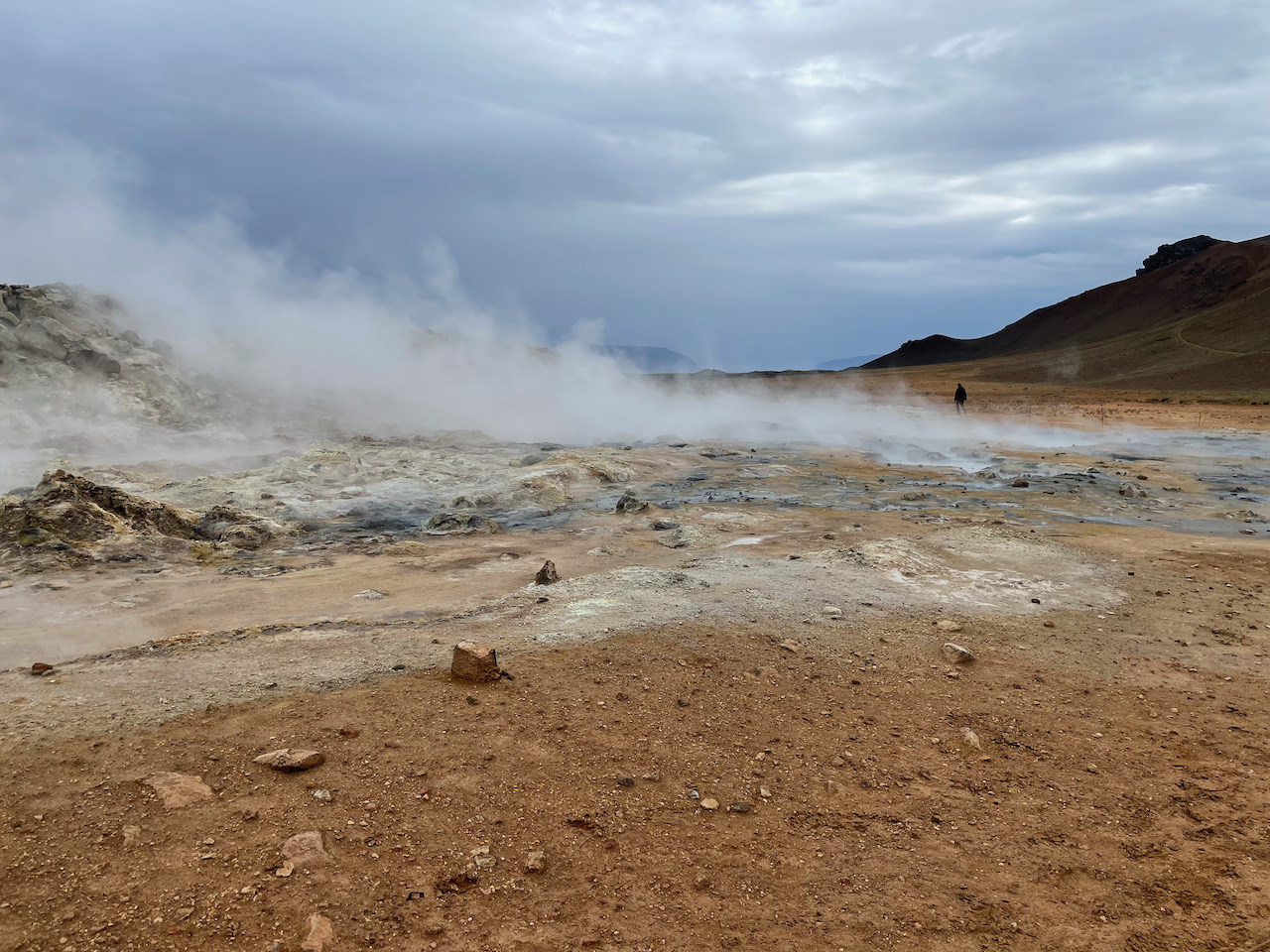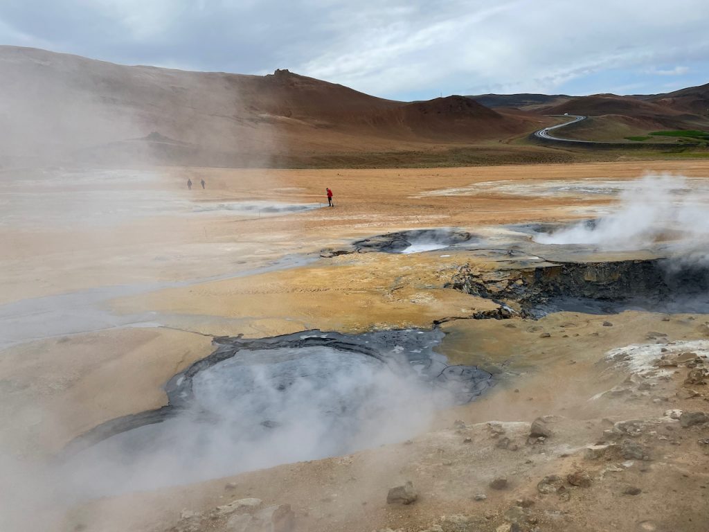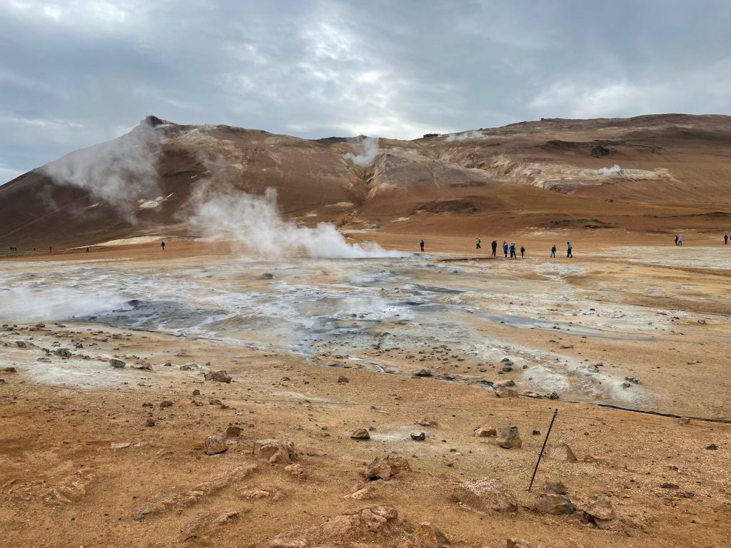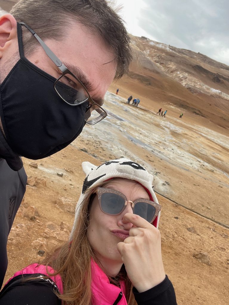 We instead headed over to the burbling, stinky mud pits and steam cones of satan’s butthole (Hverir) just past the lake. We discovered that masks do a pretty good job of keeping some of the butthole smell out. I of course forgot mine in the car.