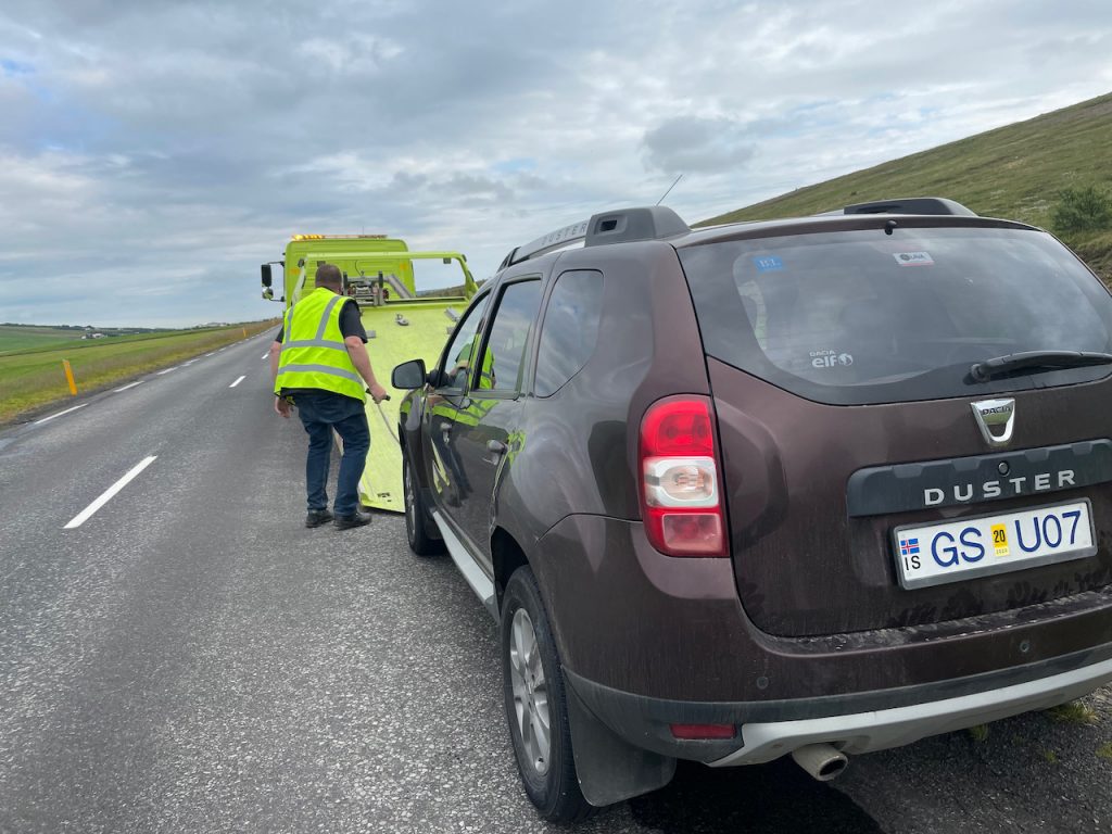 Fortunately, a few calls to and fro with the rental car company, they lined us up with a tow truck driver, who showed up about an hour later. He spoke very, very limited English, and through a series of gestures and well-meaning smiles, we worked out that the car needed to go back to Akureyri.