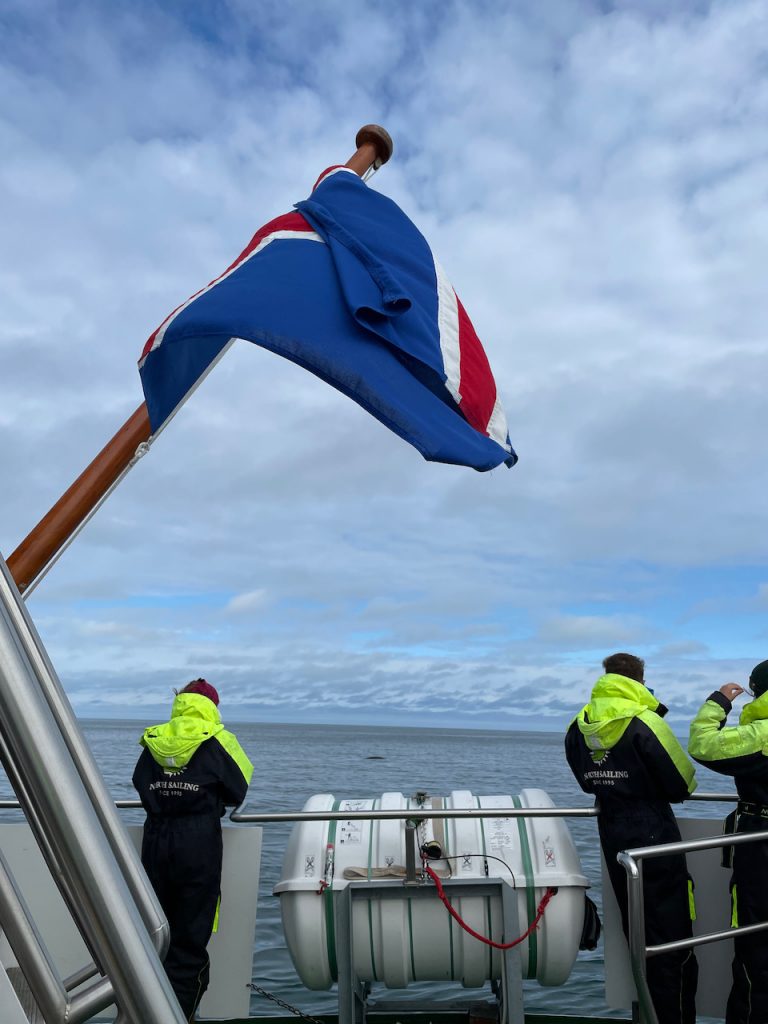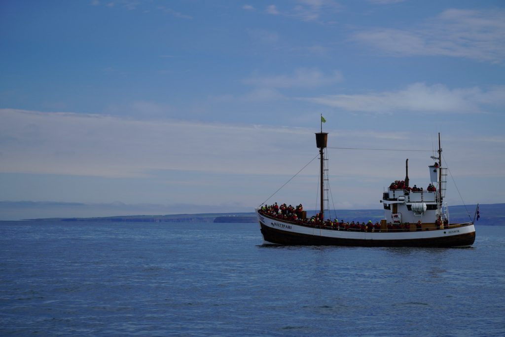 We were off – circling the fjord in search of whales, dolphins, and seabirds. We puttered out of the harbor, many whale-watching boats moored at the docks, and a large Icelandic cruise ship that was registered in the Bahamas. I decided it was called the HMS Tax Evasion.