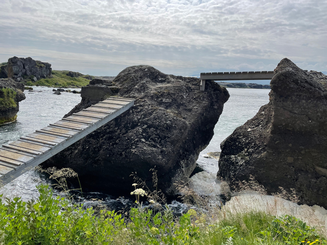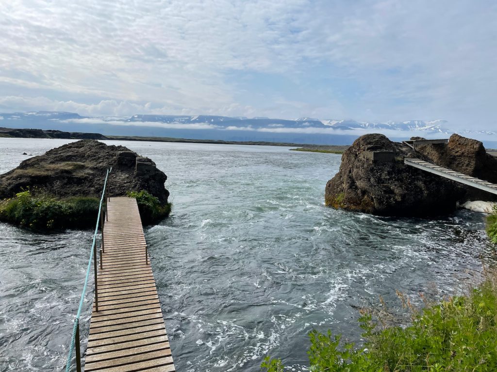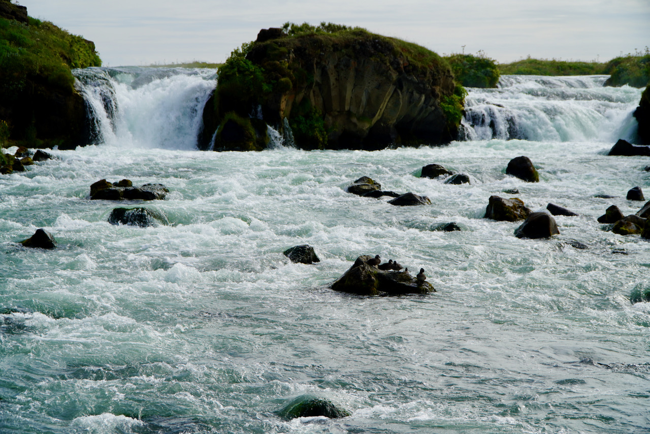The falls were lovely, spilling over some old columnar basalt as they tumbled down from the river into the fjord.