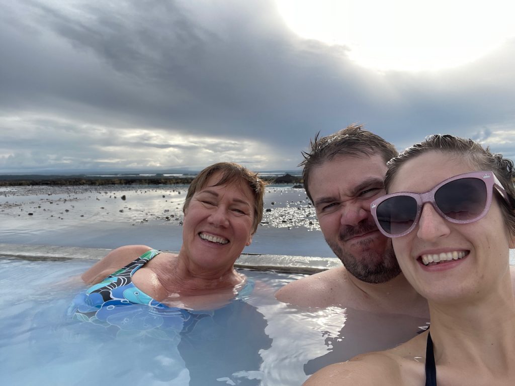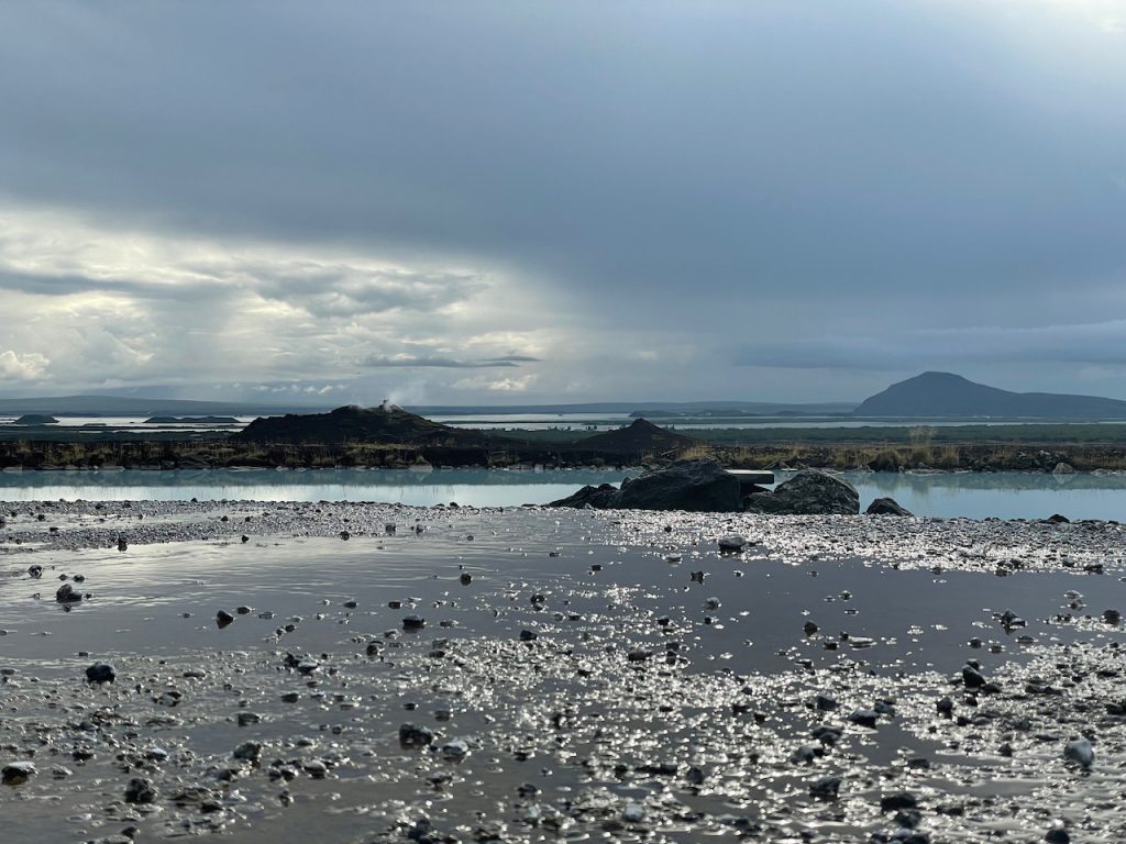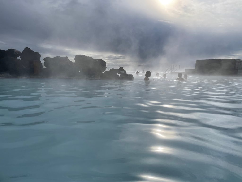 As the rain calmed down, we returned to the nature baths, with their light blue silica-laden water that smelled strongly of sulphur. I would call them “butthole adjacent,” if pressed (who is pressing?). The sun came out and we enjoyed our view over the valley and lake as we soaked in the chilly Icelandic air. In my heart of hearts, I loved the hot spring best in the gentle rain.