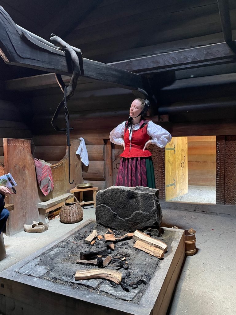 All that aside, the public transit was mostly up and running for our entire trip (except for the one time our tram was shut down due to the event at city hall). Our first stop: the Folk Museum, an open-air museum that has lots of old Norwegian farmhouses from the 1600s onwards, demonstrations, and guided tours by hosts in local costume. It was started by King Oscar II in the late 1800s, when national romanticism began to grow and Norway began to agitate for its divorce from Sweden.