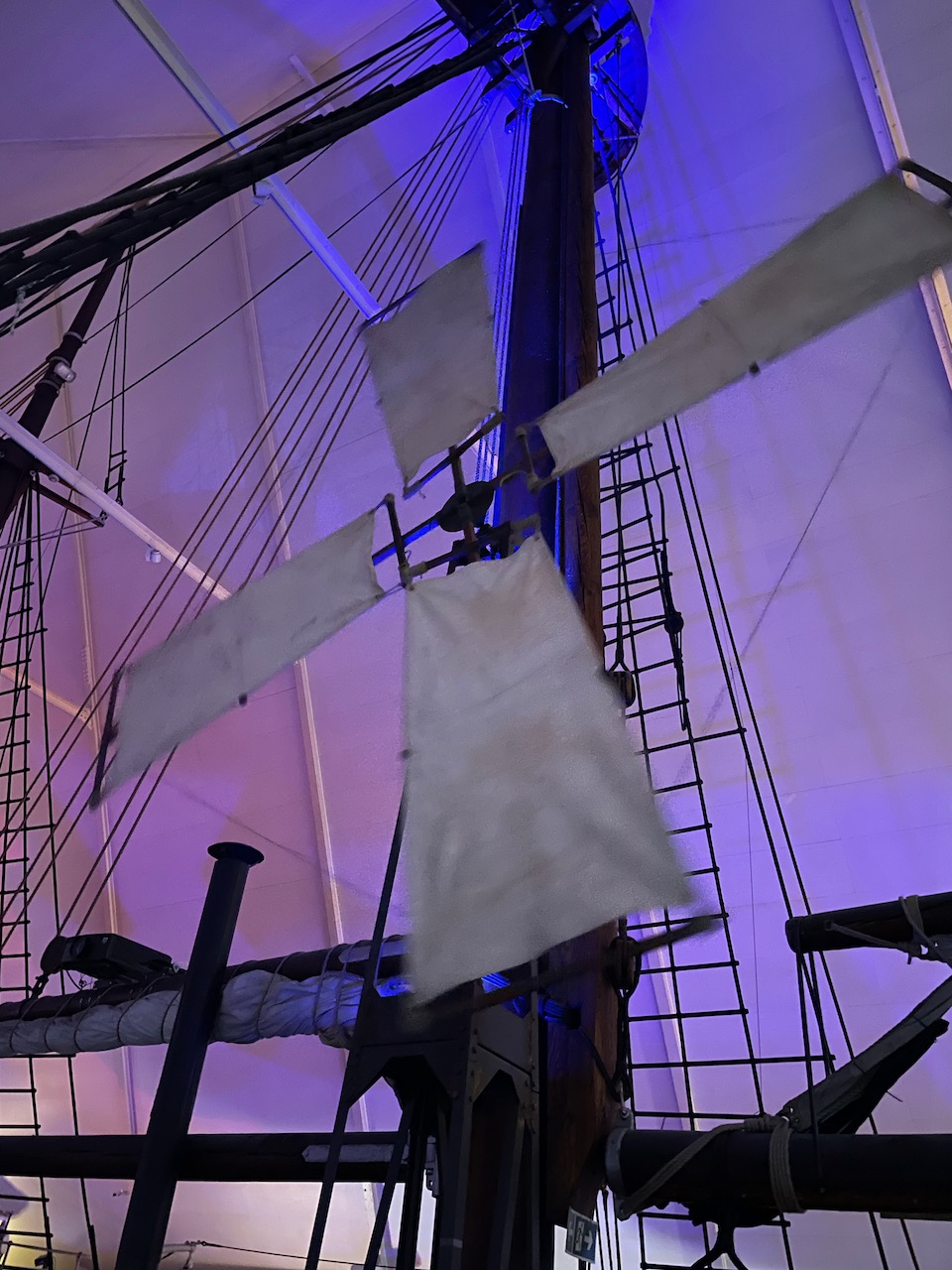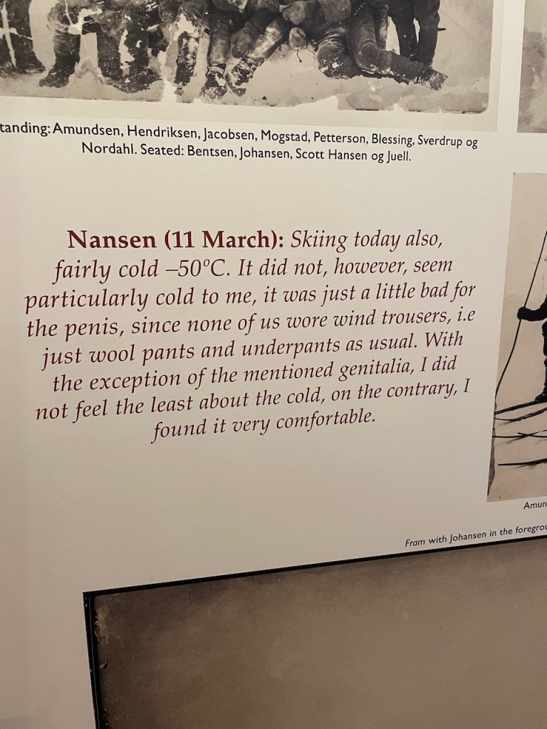 The museum contains movies, diaries, and a lot of exhibits about surviving (and not) in the harsh arctic conditions. The Fram was designed ten years after they had figured out theories of ice floes, and had been designed to be lodged in the ice and float on it for years on end. Over winters and not, the crew spent a lot of time clearing ice buildup off of it and making sure it wouldn’t get crushed, in between doing Science and punching each other. It also had a collapsible windmill that was used to generate electricity.
