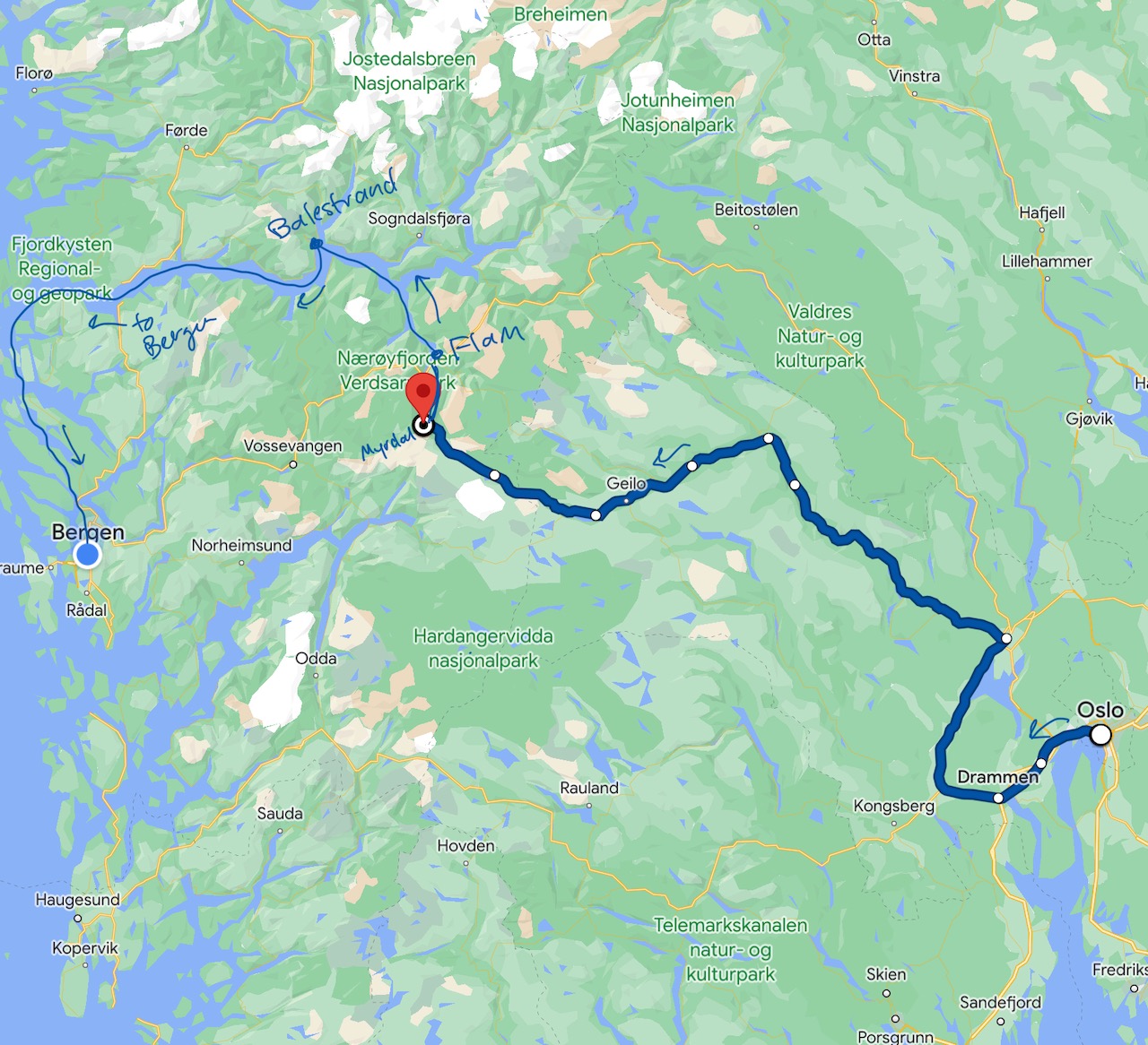 Because I have a bus curse and a disdain for other tourists on buses, we’re not doing the train-train-boat-bus-train of the Norway in a Nutshell route, we’re doing an alternative called Sognefjord in a Nutshell, which has the first train-train-boat part, spending two nights in Balestrand in the fjords, and then a final boat through the Sognefjord to Bergen. It means we skip the really narrow, dramatic Næroyfjord, but how different can these be?