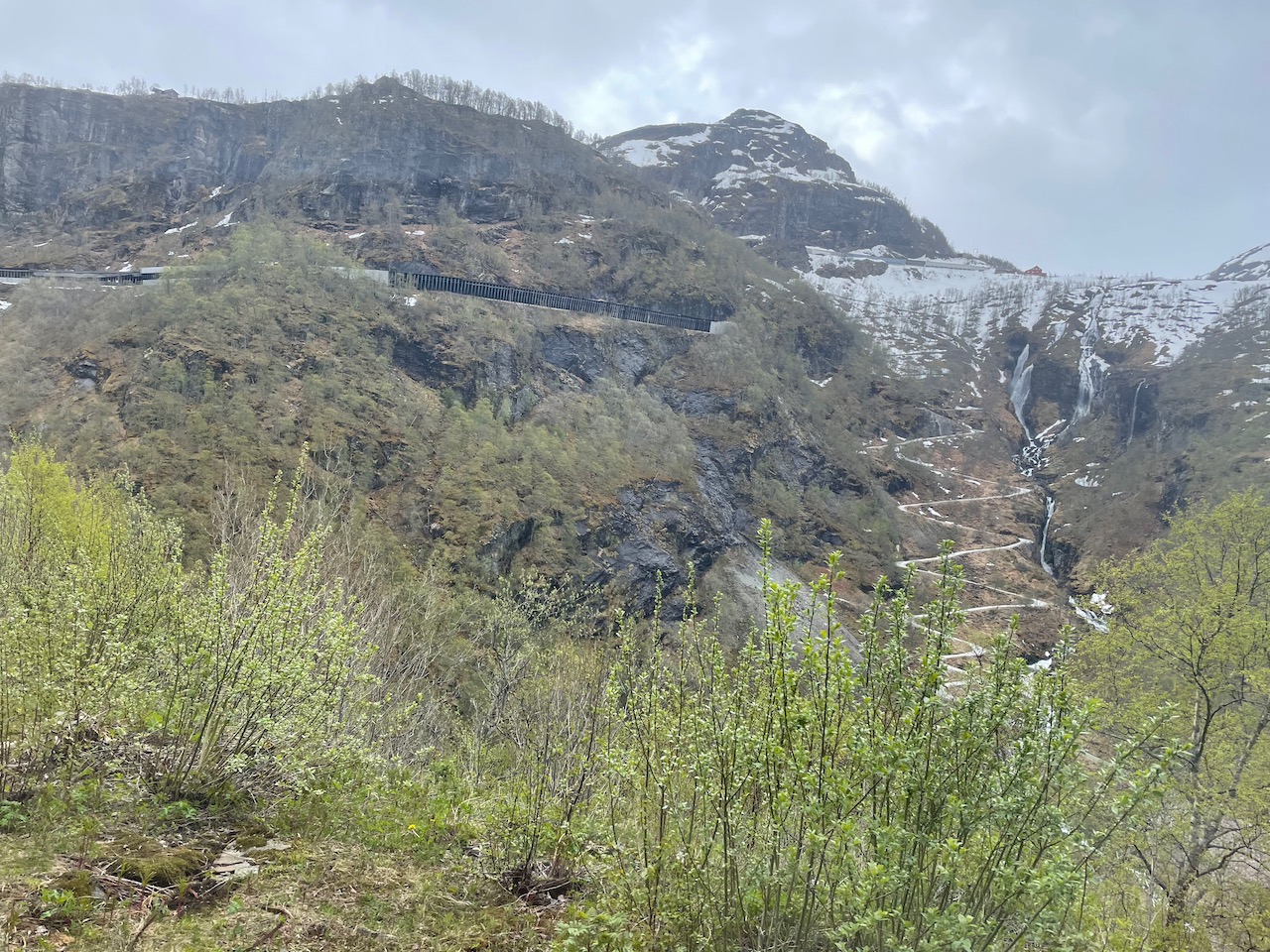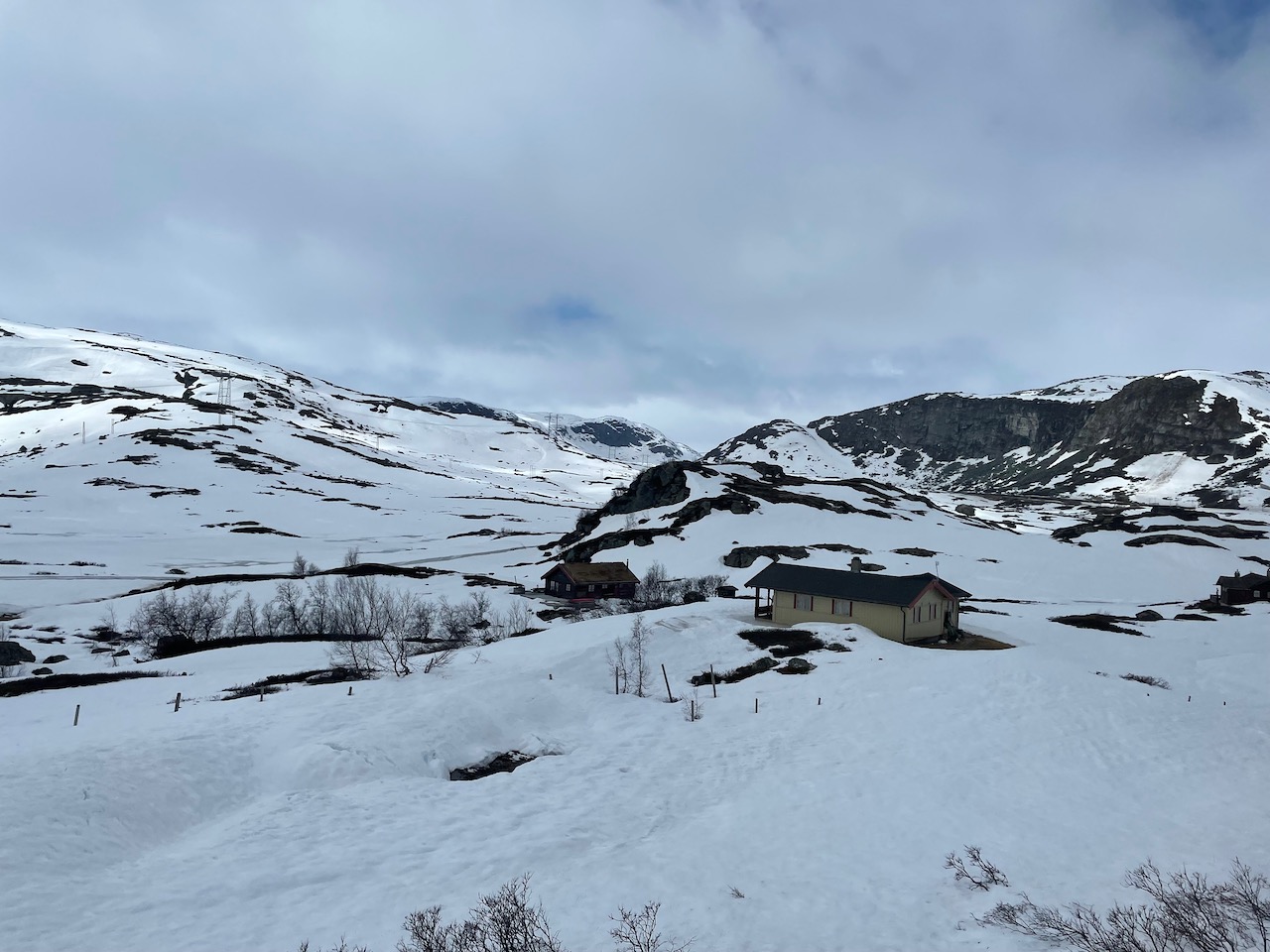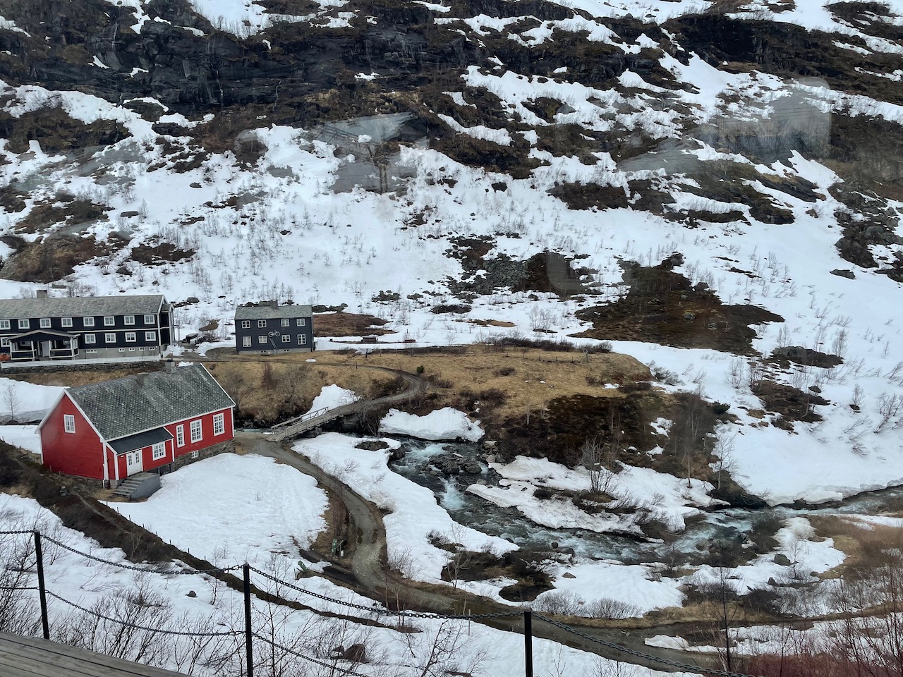 The first train: Oslo to Myrdal. It’s pretty standard for the first hour, but then you get into wild mountain lakes, lots of trees, and eventually….snowy passes. In hindsight, I am not sure why I thought there would not be snow up at elevation, but there it was. Feet and feet of snow, and some very abandoned train stops by research stations. We had only just left the snow behind.
