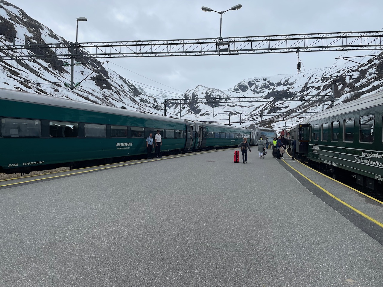We left Oslo on Friday, destined eventually for Bergen, but not until we traversed the dramatic Norwegian landscape. I take deep offense at paying markup for something I could book for myself with a bit of effort – and that was how I felt about arranging our scenic passage from Oslo to Bergen – aka the Norway in a Nutshell tour. This the time-worn tourist trek between the two cities takes you from Oslo on a train up through a mountain pass, down on the world’s steepest railway, the Flamsbana, and then a boat through fjords, followed by a bus ride, and a final train into Bergen (or the reverse).