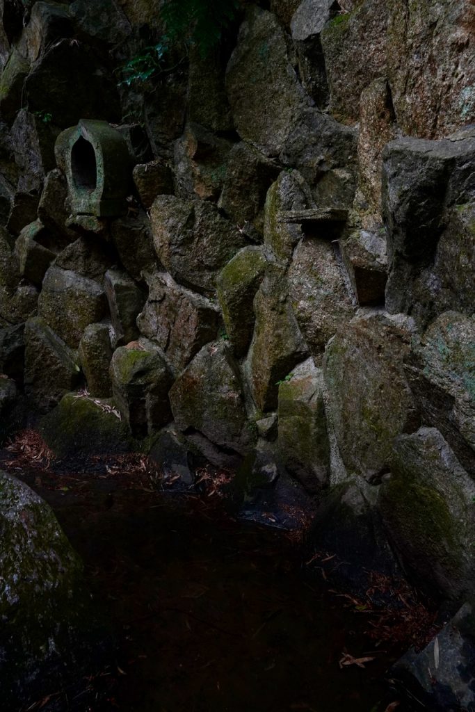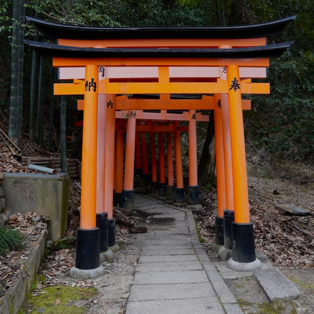 You can walk through a bamboo-lined path and into a ravine with a creek and a mossy and forgotten-looking sub-shrine. Because I’m a boring adult, all I can think of is how expensive these heavy stone gates must have been and how they’re all just back here collecting spirits and moss.