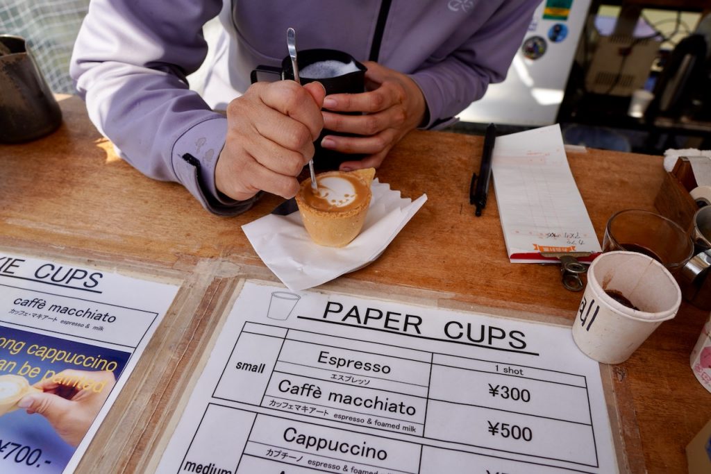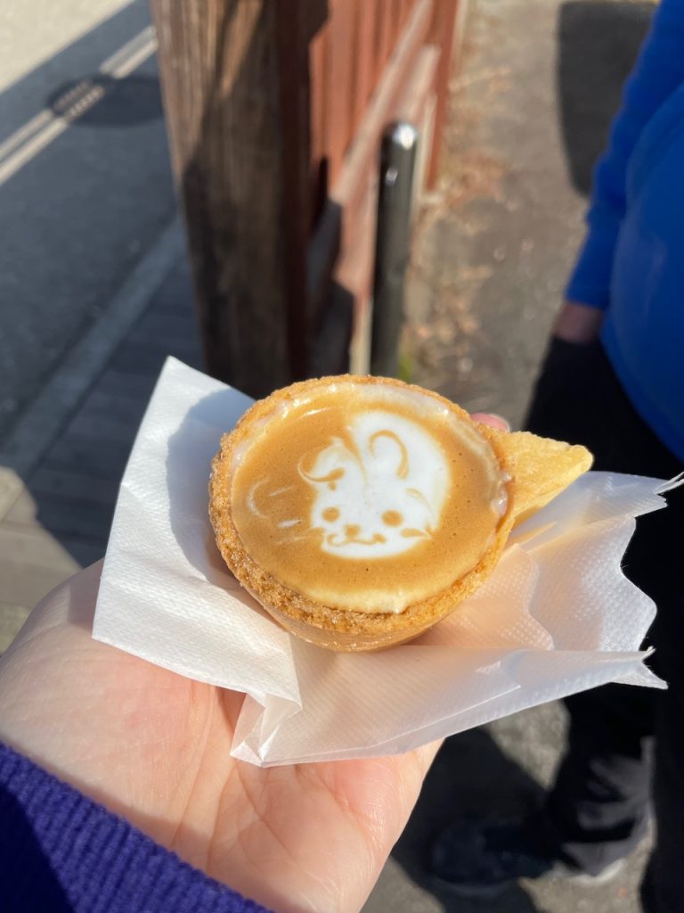 There are street vendors selling produce, cappuccino in a cup made of a cookie (why do I get these things when I don’t like coffee?) which was good (!!), and then some taiyaki. It’s a bit early so there’s not a lot of produce, but the snacks and crafts were neat.
