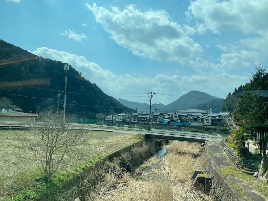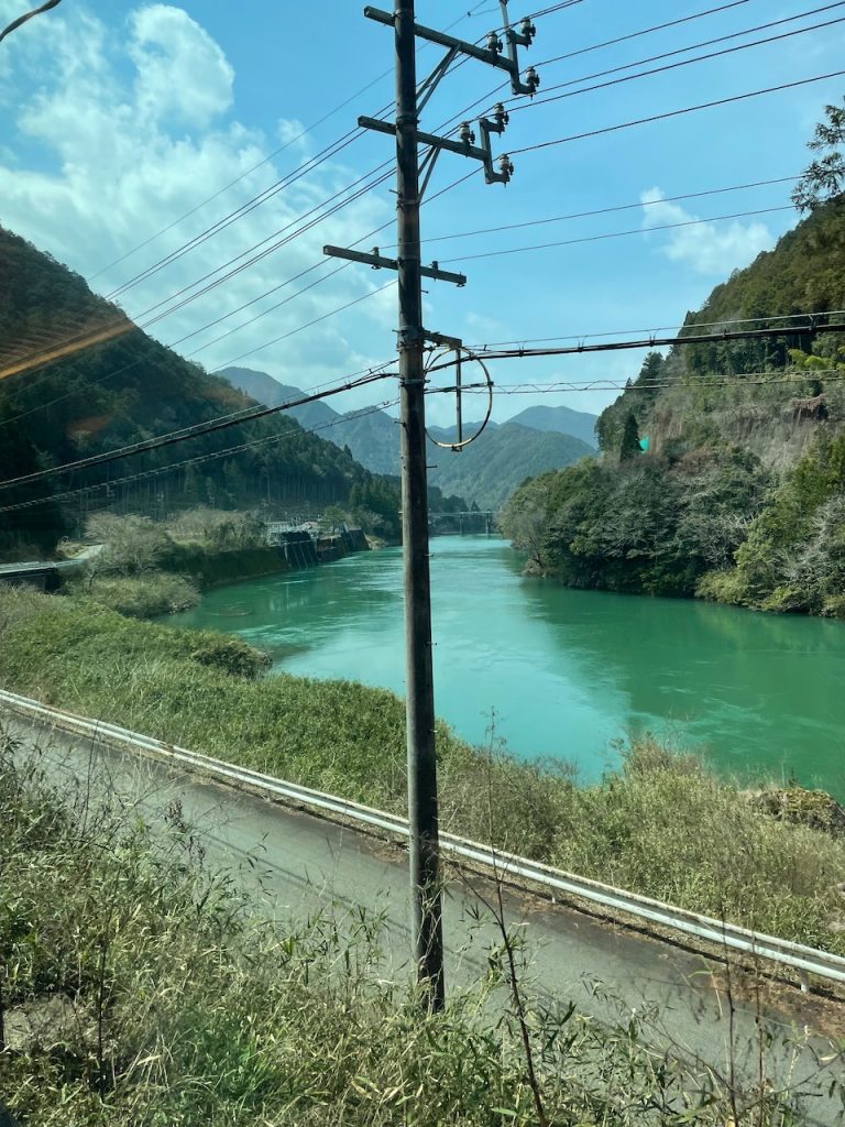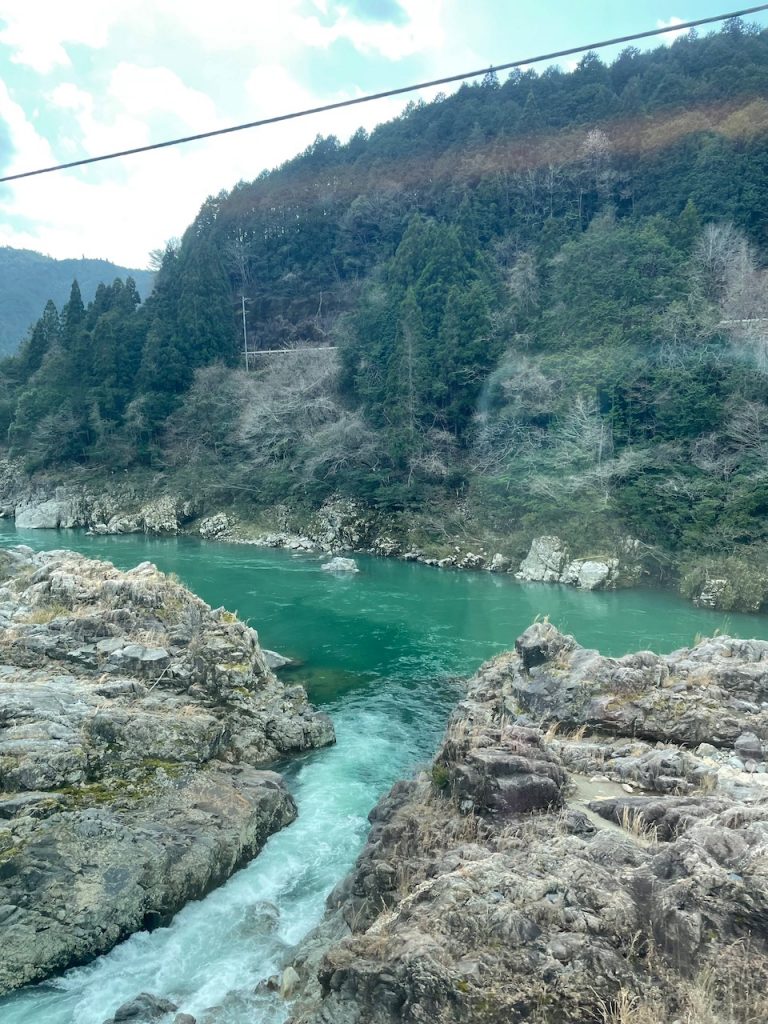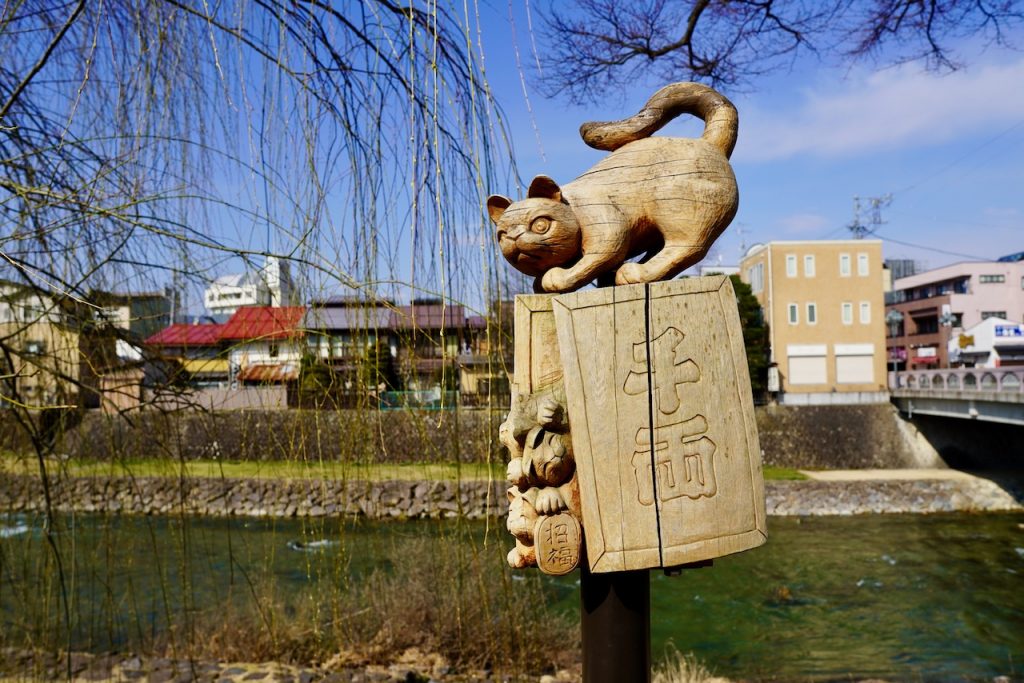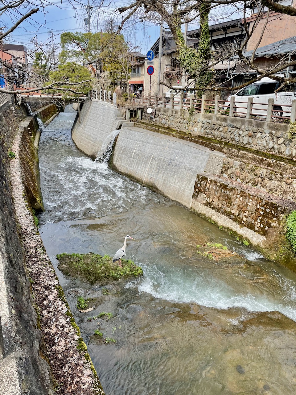 First, we go from Kyoto to Takayama, changing from the shinkansen to a local express in Nagoya. You take a train up and into the mountains, winding through a river through the mountain. They tell you Gifu Facts periodically as you go – about the crafts that depend on the river, the purity of the water, or the fishing technique the locals employed which used birds to fish. NEAT.