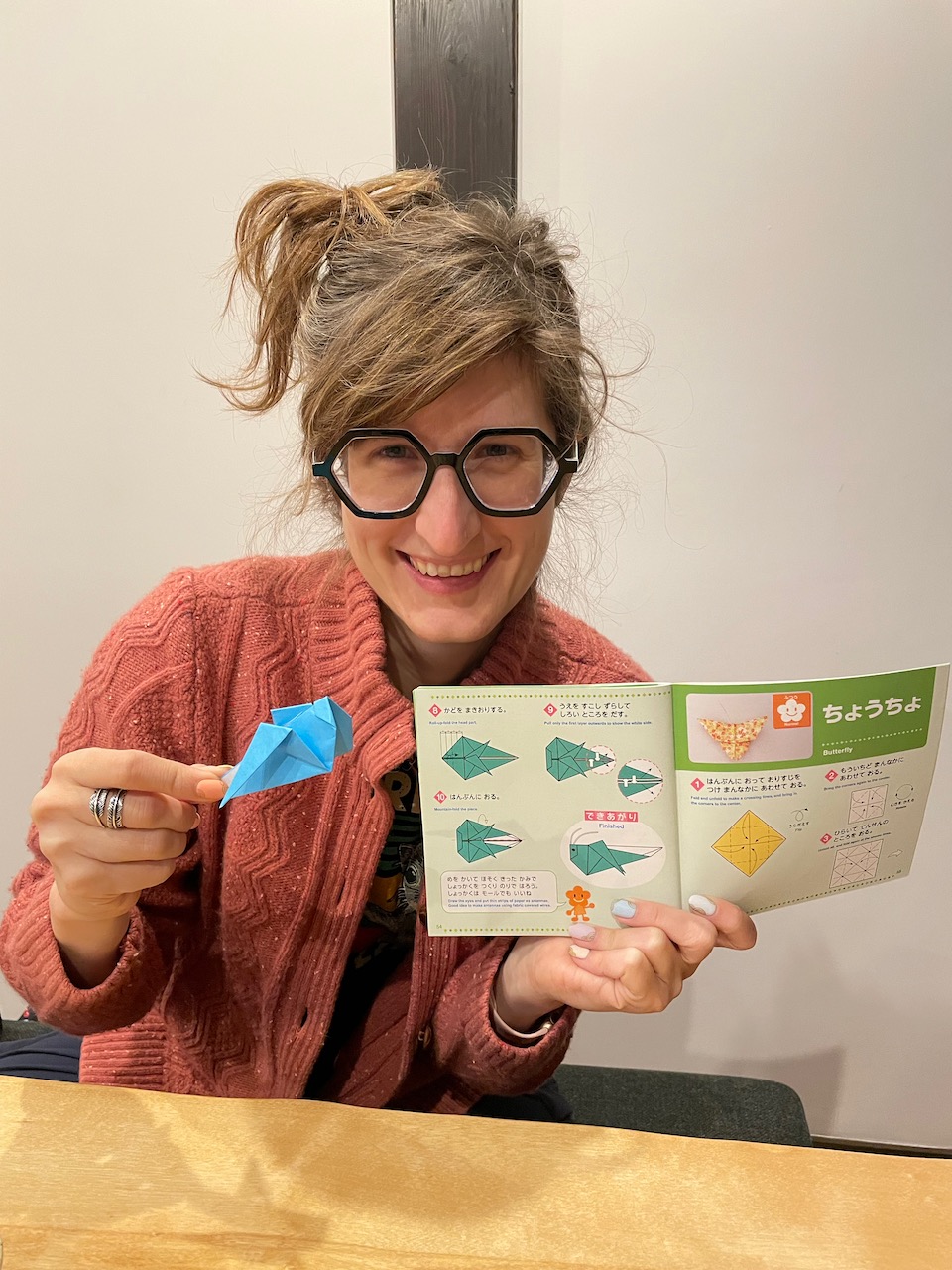 After resisting all of the souvenir shops on the way home, we relaxed in the temple common area for an hour until it was train time. After much struggling, I managed to fold an origami grasshopper, my new pride and joy. Time for Kanazawa!