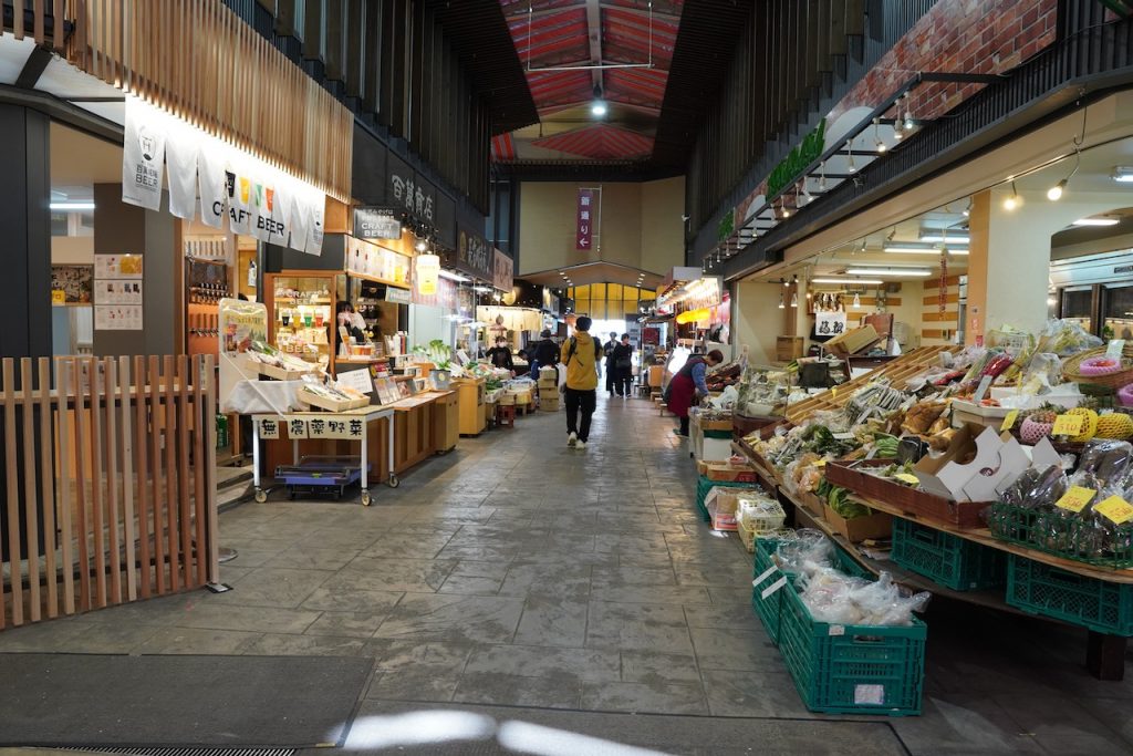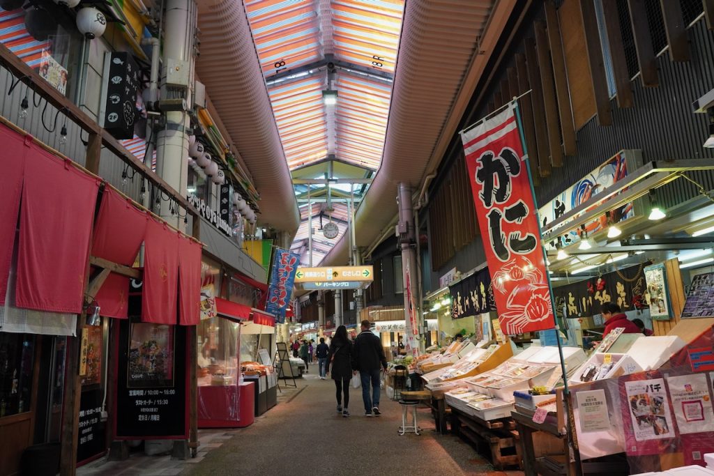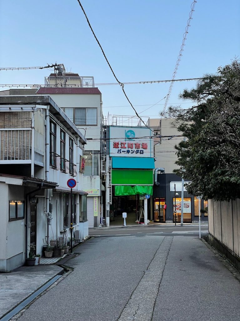 I went for a walk around our neighborhood to scout dinner. We’re staying near Omicho, Kanazawa’s famous fish market. Kanazawa is one of the country’s gateways to fish, so supposedly the fish you can have here is the best. This is a very logical pick for my vegetarian self. Maybe I didn’t tell the robot I was vegetarian (but also, I have not been having a hard time finding food). Between the fishmongers are little restaurants selling fish and local specialties.