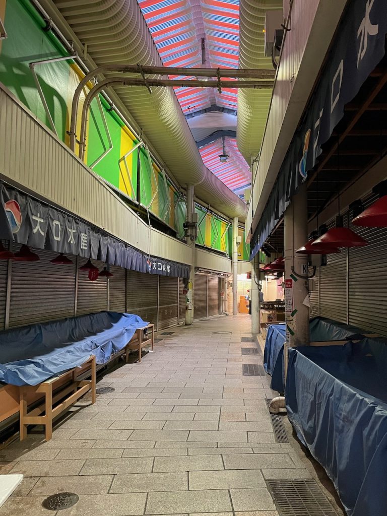 The market is super liminal at the tail end of rush hour, with the stalls closed up, colorful bright light filtering in from above, and a few straggling commuters passing through it. It’s peacefully fishy.