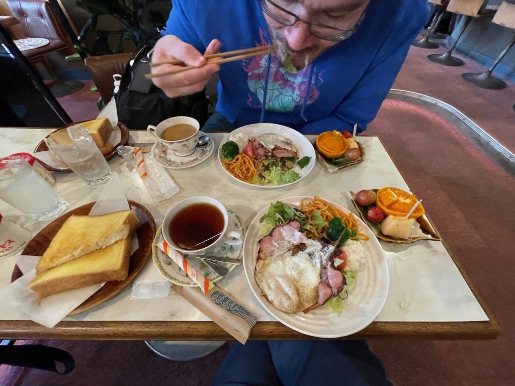 You just say you want breakfast and specify coffee or tea. For 700 yen, you get a PILE of food. Rhett gets to have my ham, and he is very happy. I get shokupan, and I am very happy. The energetic and adorable ladies who run the restaurant compliment my Japanese. Wins all around.