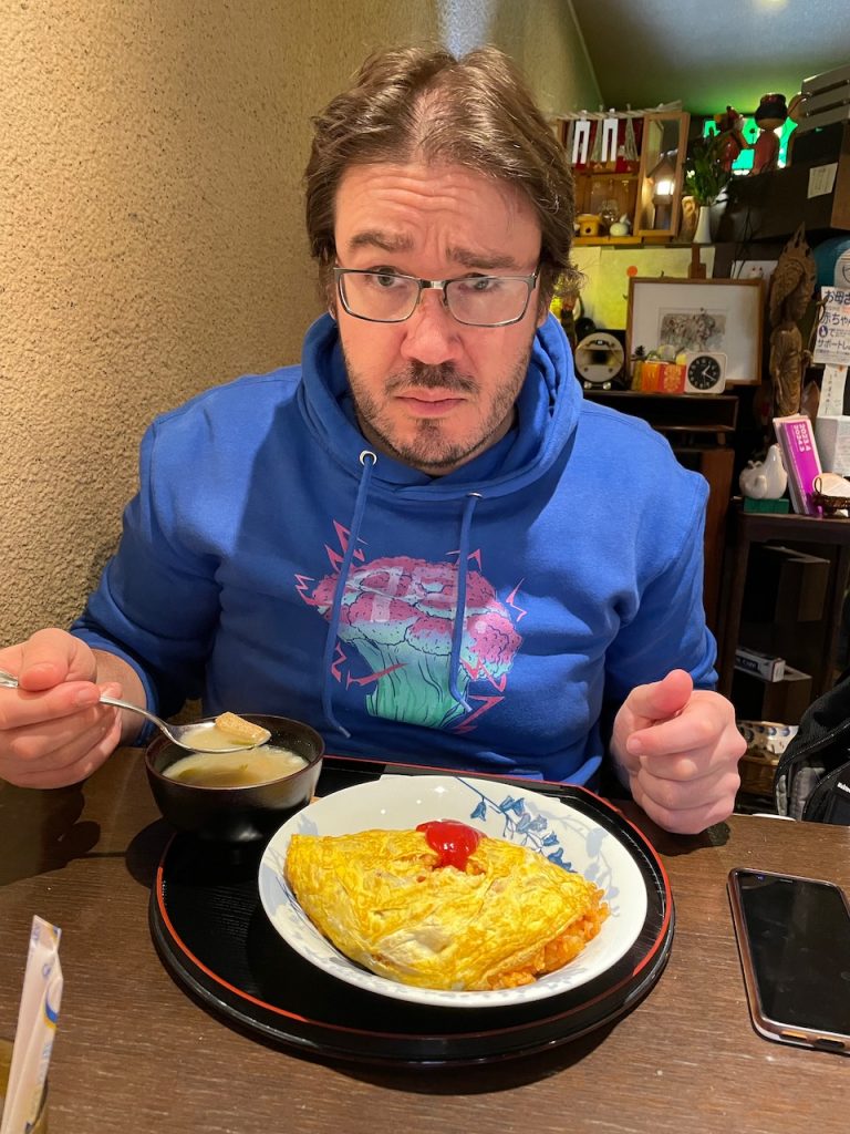 Our food stop was a random jazzy cafe set back from the street across a canal, where I got even more shokupan and Rhett got omu rice (rice with an omlette on top). It was super Tokyo and reminded me of Persona 5. Rhett does not often like jazz, but he likes omu rice.