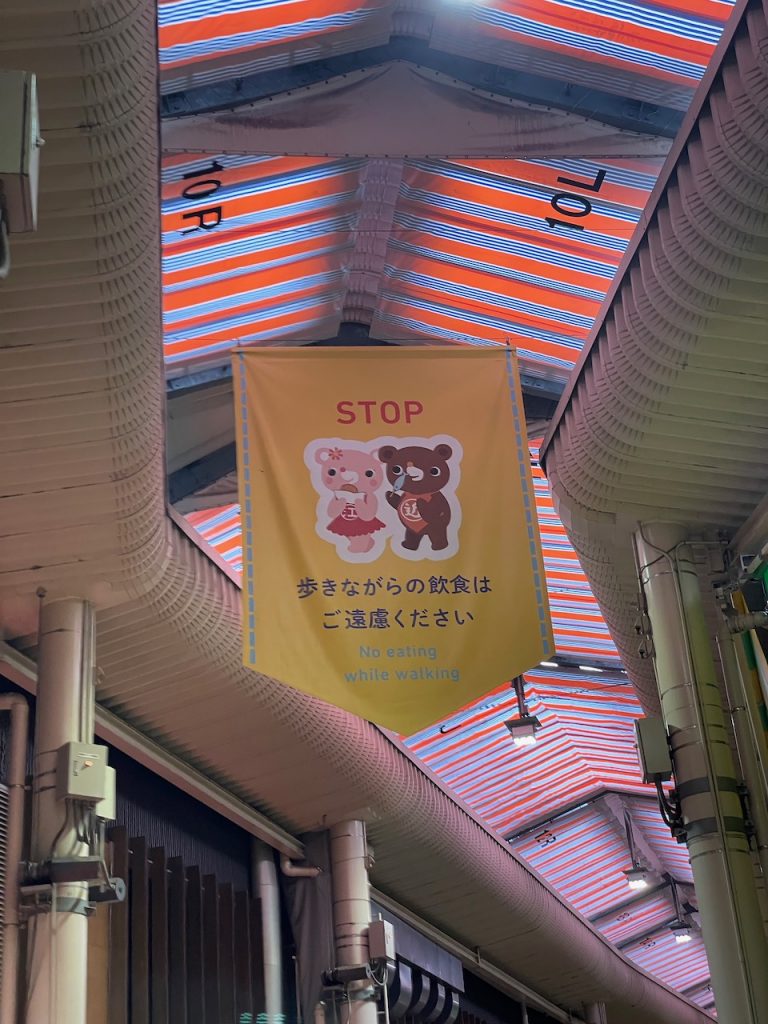 Japan’s #1 rule is no eating & walking. There’s a sign way up top in Omicho about not eating & walking, and several signs near the vendors.
