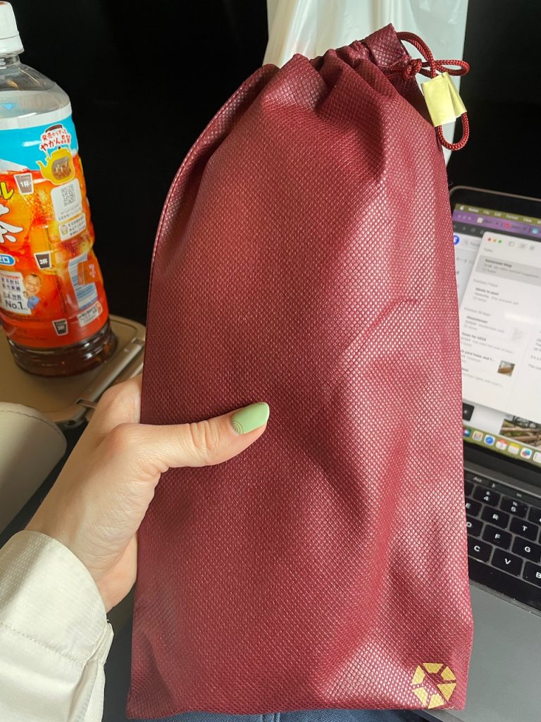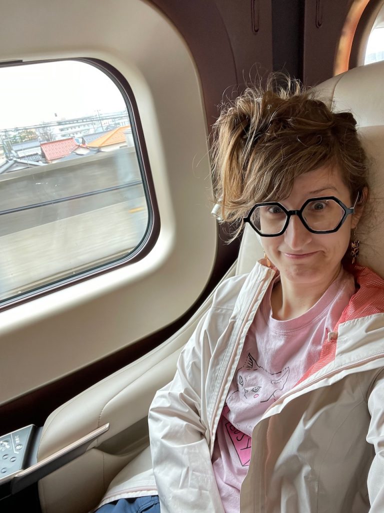 We’re off to Nagano on the shinkansen. This is one of my fancy train rides: I booked Gran Class. This is a new ultra first class, above green car. You get a little seat pod and on some routes, they serve you food. I have train slippers. This was only an extra $50 or so for our route and is so worth it. The only downside is that there’s not a ton of luggage storage.