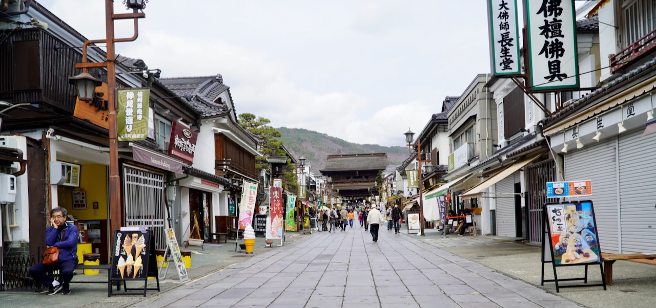 The road up to Zenkoji temple is dotted with street food vendors and shops and cafes. The food looks incredible. We will be back when we hunger more, but we are now full of oyaki.