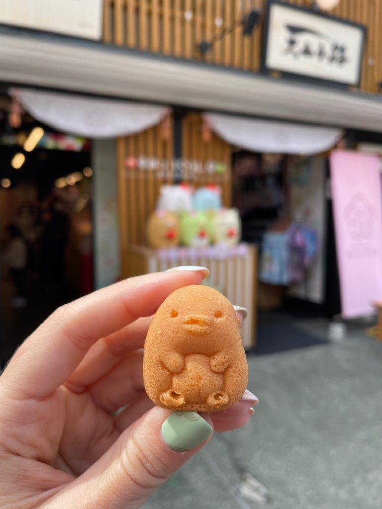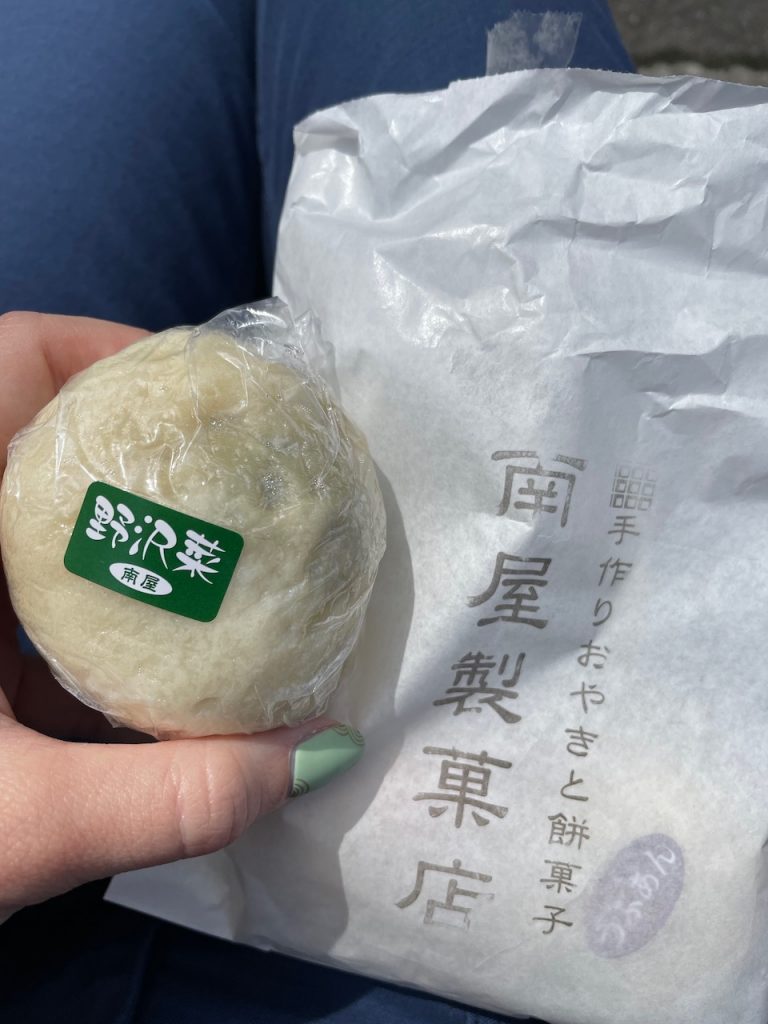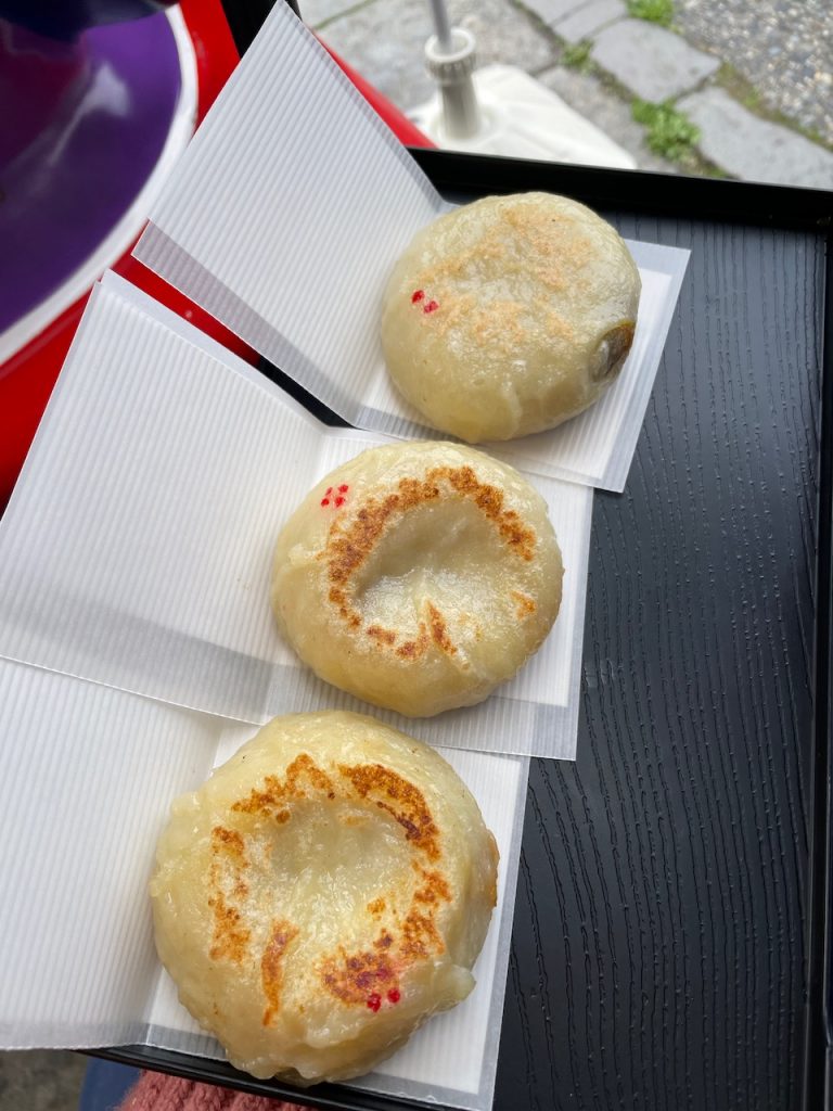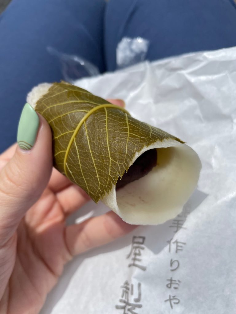 Working camera in tow, we stop at a cafe for one of the local foods, oyaki. They’re small buns filled with vegetables. At long last, a vegetarian street food! We also bought a special spring flavored one, which is red bean wrapped in a leaf. It is a delicious stop.