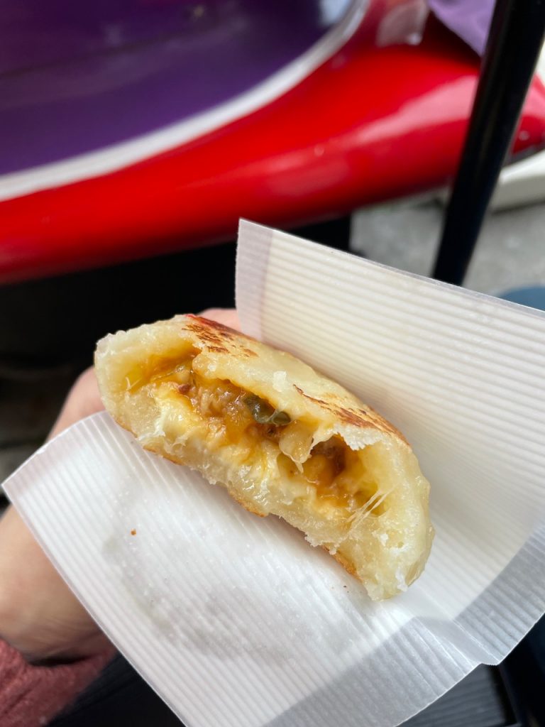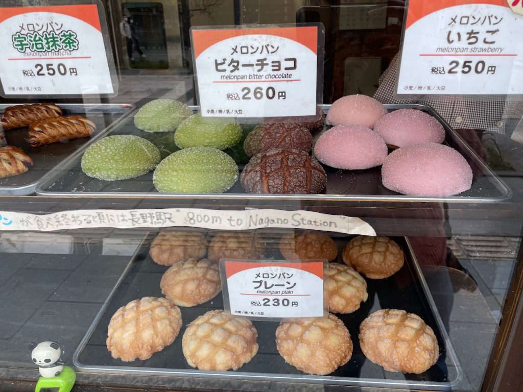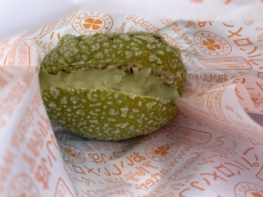 On the way to the camera stop and the station, we found a bakery that sells all kinds of melon bread. I got a matcha melon bread filled with matcha. It was our new child.