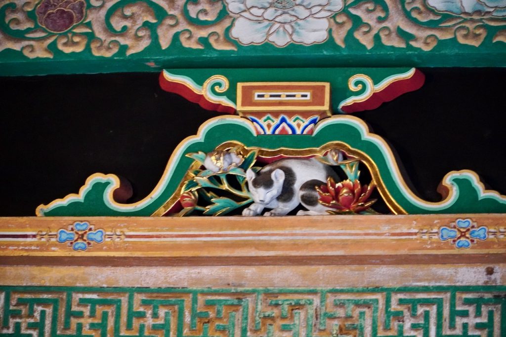 For your entry fee, you get the privilege of walking up 207 steps, each made of single stone, to see his tomb. There’s a sleeping cat carved into the gates on the way to his shrine. I’m here for the cat and for the trees.
