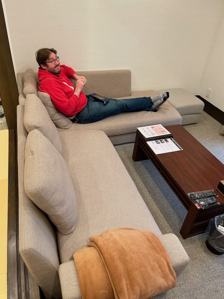 Our hotel room is Japanese-style, but two things are remarkable about it in this: the ceilings and transitions between each room are SO high and Rhett can’t hit his head, and we have a real live lounging couch. If you’re in a home, these aren’t so rare, but there’s been a lot of tatami-style floor sitting on this trip, which is not Rhett’s favorite. When booking, I was only looking out for showers that he can fit into and beds that won’t confine him, and forgot to think about the sitting spaces. Oh well. Next time.