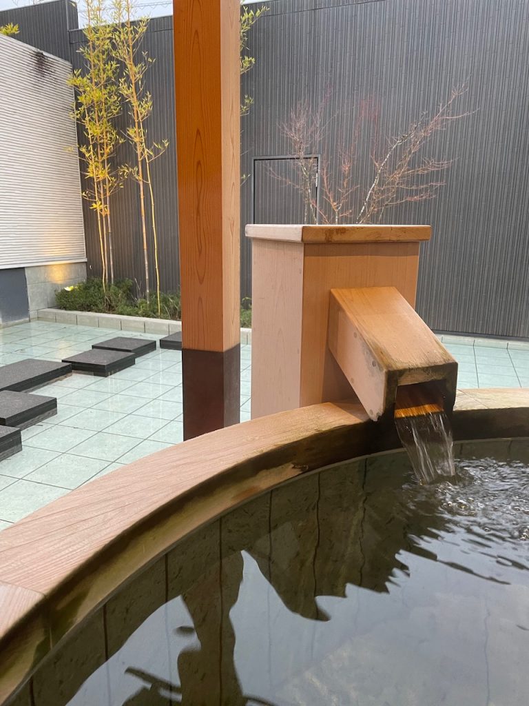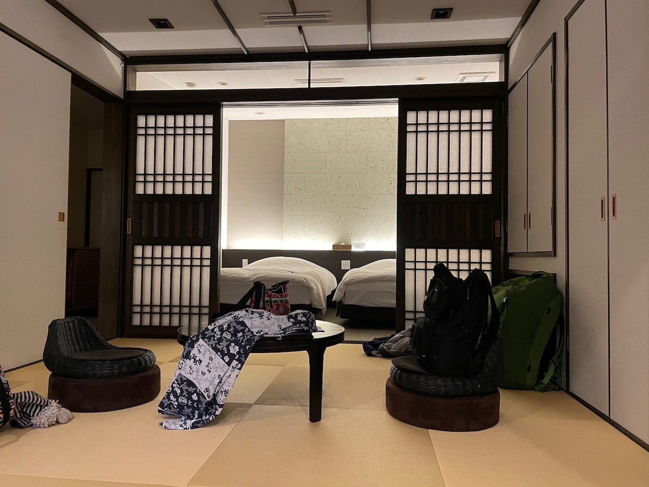 Our suite features an outdoor bath, a water garden with a patio, and some bamboo. They give us yukata to wear, and Rhett fits into it. The toilet salutes you by opening its lid when you open the door. The floor is strategically heated. It is the best.
